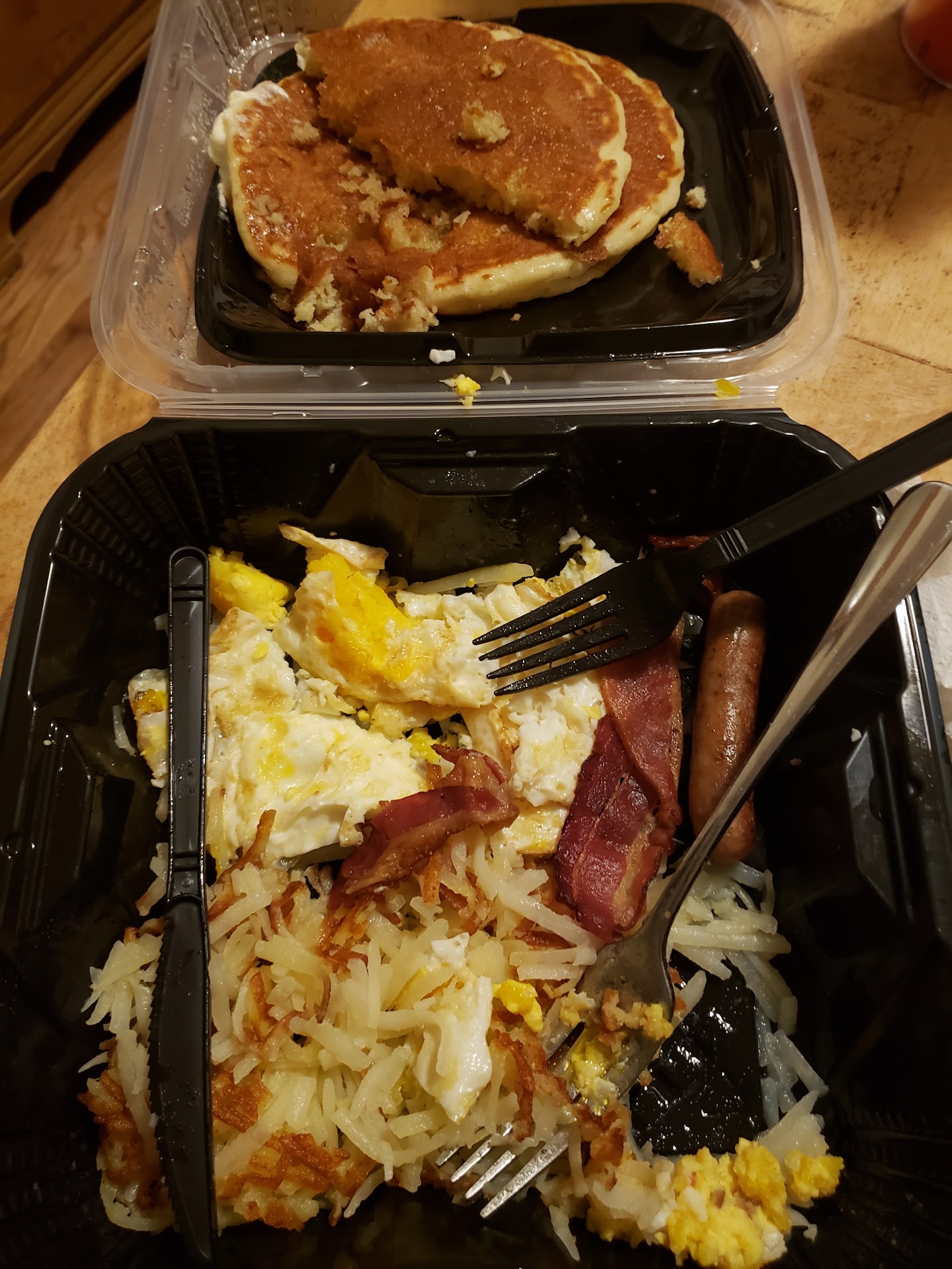 Somehow I finally get her attention and she says she'll get the check and a box for us. She then goes outside. We never see her at the table after that: another server brings us the check and a box; we ask for a coffee refill which he never shows up with. (I don't blame him, he had other tables to take care of, she shouldn't have shunted us off on him!) My bf sees our waitress come back in, only to then walk straight to the bathroom. We finally give up and go pay, like I said the host was great.