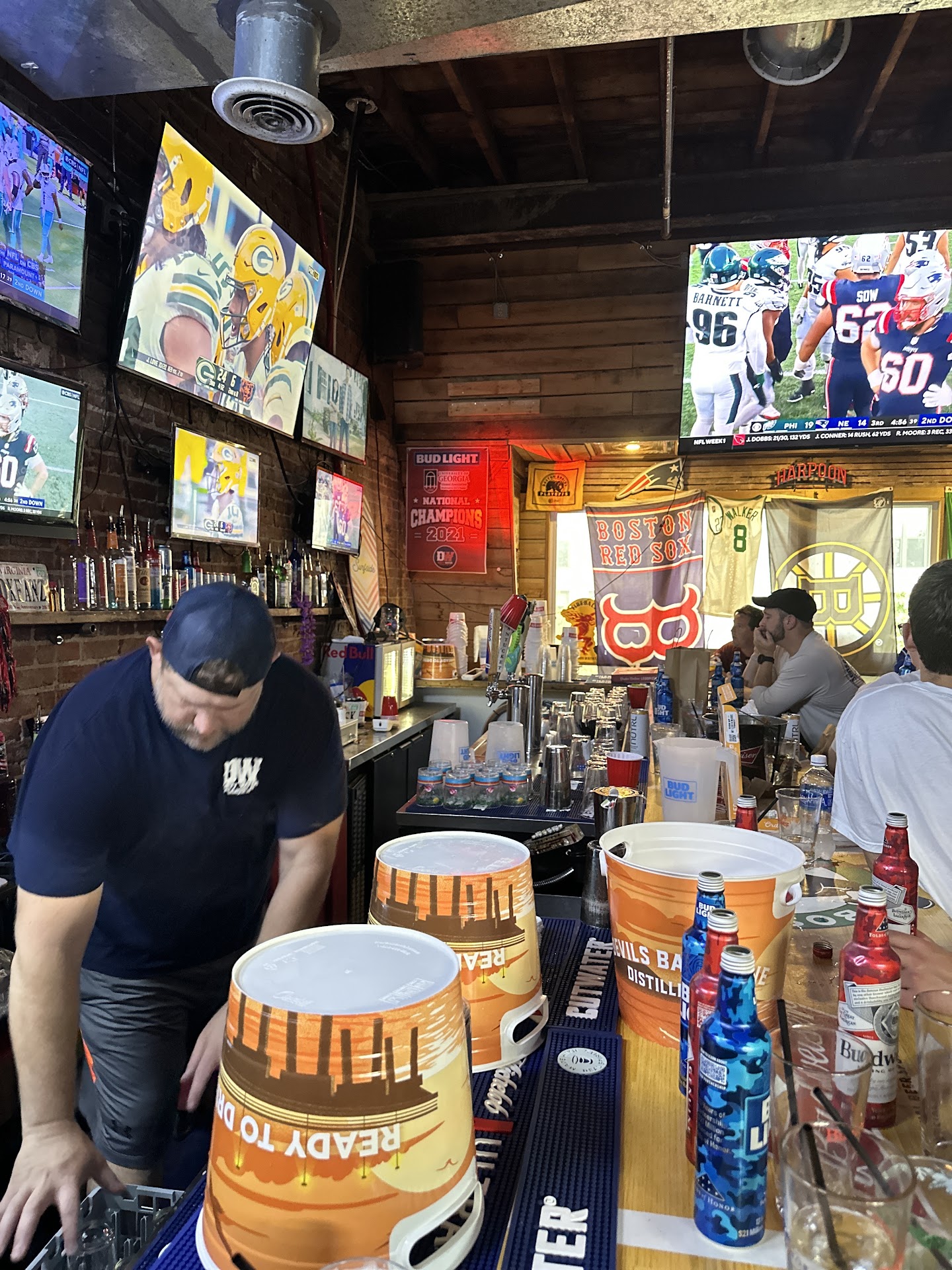 I went here Sunday afternoon for a buddyâs birthday. It wasnât hard technically to find the place since there is a street level door with the street address number clearly printed on it. I guess I was just looking for a sign and I was kinda out of it. But isnât that the supposed to be cool kind of thing nowadays? The whole speakeasy, no sign on the door, you get points just for finding it, vibe? This place satisfies all my sports bar requirements: cheap drinks, friendly, laid back bartenders, and a good menu of tasty bar food. Itâs a small space for the bar itself on the top floor so donât plan to big a group but half the roof is uncovered and they had a decent live band playing and it was a really nice afternoon so al fresco was the way to go. It didnât have that trying to be laid back vibe. It was just laid back. Oh itâs a Boston sports bar, too, just to warn you New Yorkers. If you need to root for the Celtics or just want a chill beer, head to...
