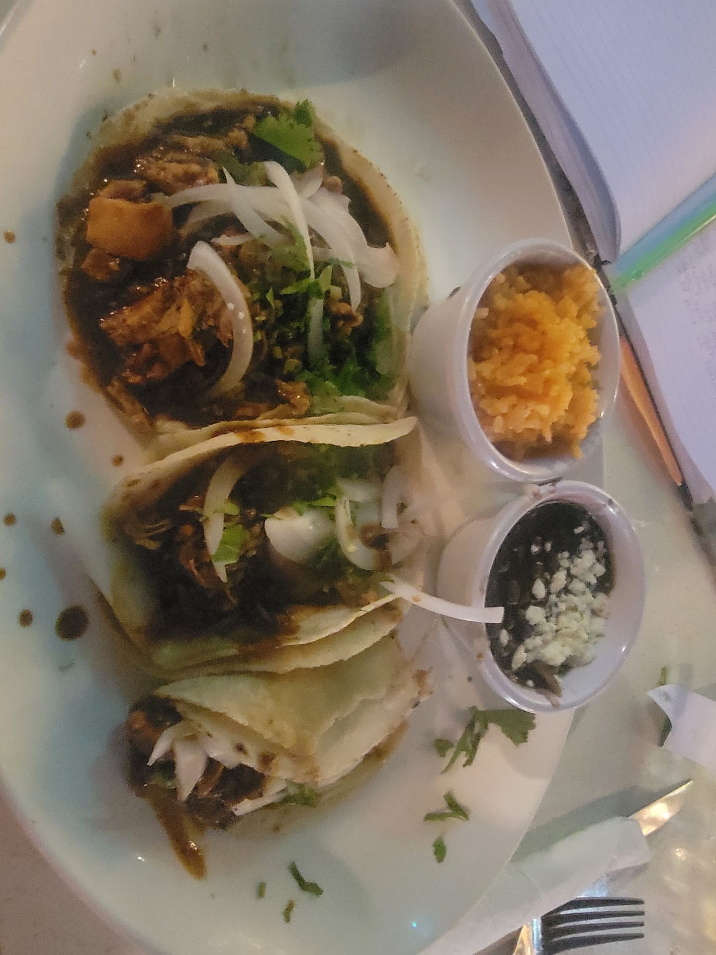 I go to Mexican restaurants for chips and salsa. I'm gonna say I'm a harsh critic when it comes to Mexican food due to living in SoCal so I usually have high expectations of the food that most adore. Needless to say. The food was okay but not mind-blowing delicious. The chips are not freshly made which is always a disappointment. The tacos de mole was overly sauced where took a bite it squart out mole sauce overpowering the cilantro and onions in the taco. But on a positive note, the chicken wasn't dried and the rice and beans were pretty good as well.