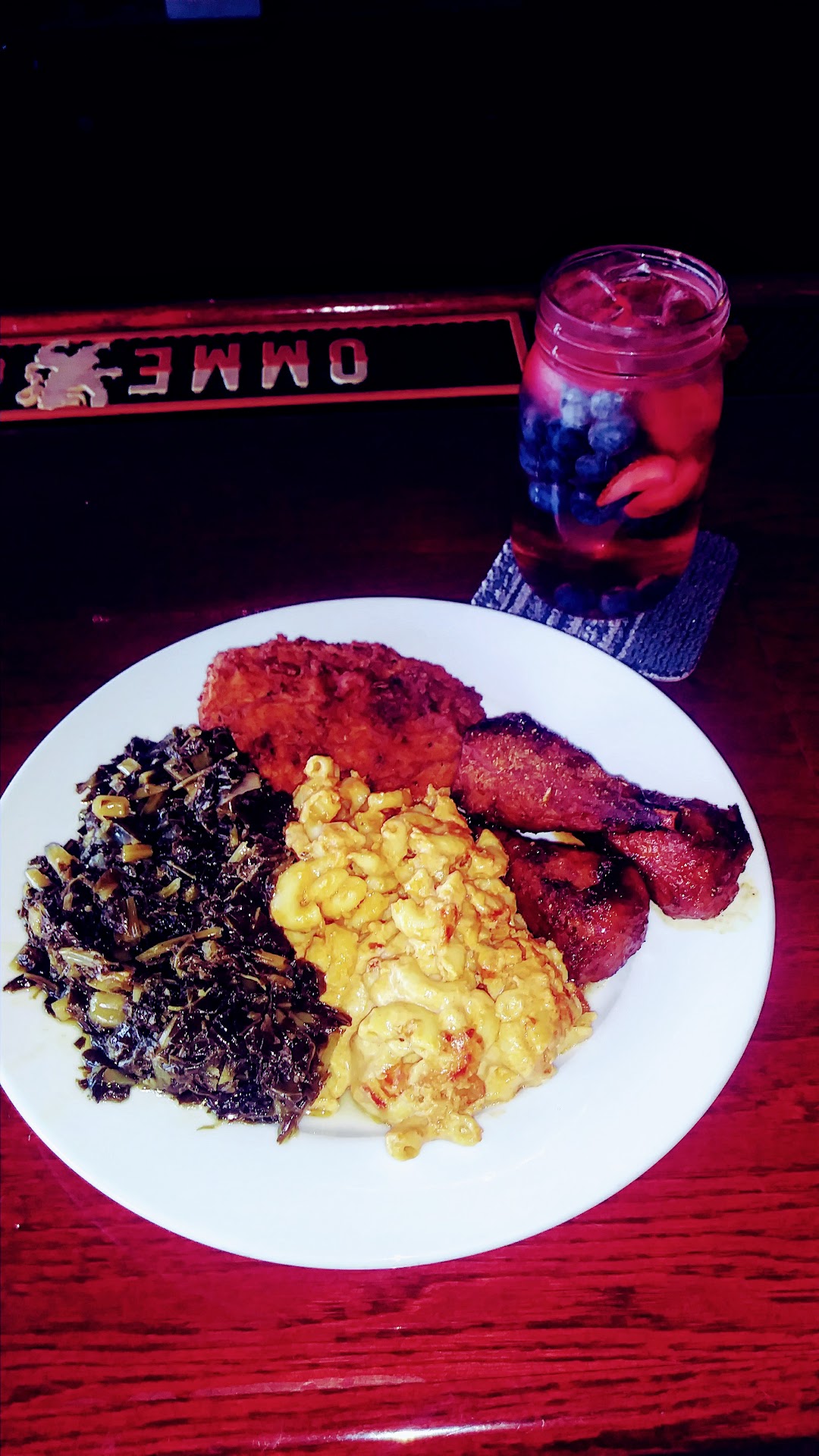 On Saturday, April, 11, 2015 my husband and I along with two of our friends decided it was time to visit Evolve Vegan Restaurant. The ambiance of the restaurant was good. The lighting and décor was warm and inviting. We ordered a few drinks at the bar before we were seated. My Malibu with pineapple cocktail was watered down and had too much ice. We wanted to try a little of everything especially after reading the rave reviews this place received on Yelp. So we ordered the infamous Macaroni and Cheese, Sweet Maple Kale Salad, Yams, Vegan Tuna Salad, Collard Greens, N’Orleans Macaroni Salad, Southern Fried Chick-un and Chick-un Drumsticks. Our waitress, Stephanie returned to our table shortly after taking our order to inform us that the Yams and Sweet Maple Kale Salad were not ready. She also informed us that she was not sure how long it would take to be ready and suggested that we order something else. We decided not to order anything else and to just wait for the rest of our food to arrive. However, while we waited we did decided to sample the lentil soup. It tasted okay but we chose not to order a full serving.