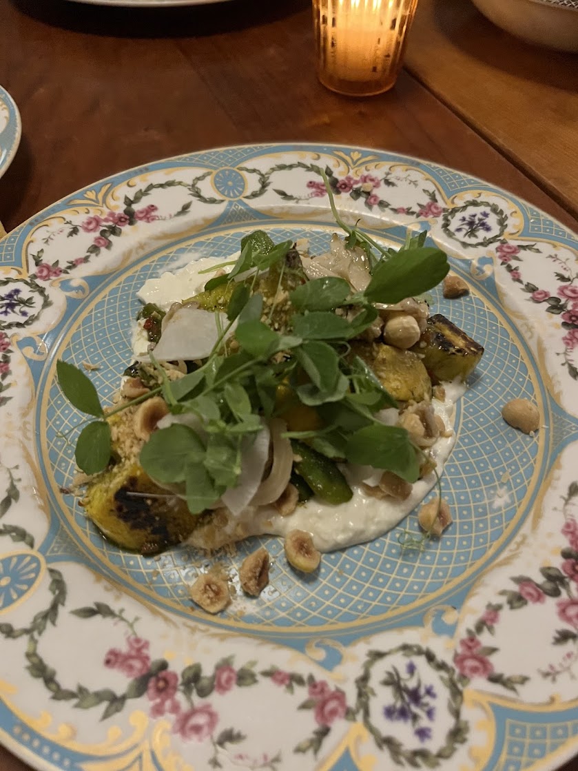 More recently, we had grilled brown bread with cultured butter, sauerkraut, and Doritos spread. You wouldn't expect sauerkraut and Doritos spread to go well with toast but they do! We also got grilled gem lettuce - also a lot better than it sounds. The sole disappointment was the Comté tart which was just too cheesy. The last appetizer was the barbeque carrots which were outstanding. Our main courses were black pepper cavatelli which was solid but not spectacular, and fried tempeh katsu which was AMAZING. It was kind of like a fish sandwich for people like me who don't normally eat fish. Finally, we wrapped up with a delicious morsel of honey goat cheesecake.