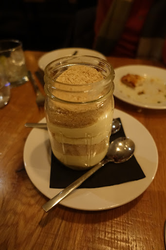Finally, we had the banana cream pudding, which was delicious! Itâs a little different from most banana pudding. Itâs kind of a trifle, with pudding interleaved with something like tiny cookie crumbs. They apparently run out of this regularly, so check when you get there! We got a second one...