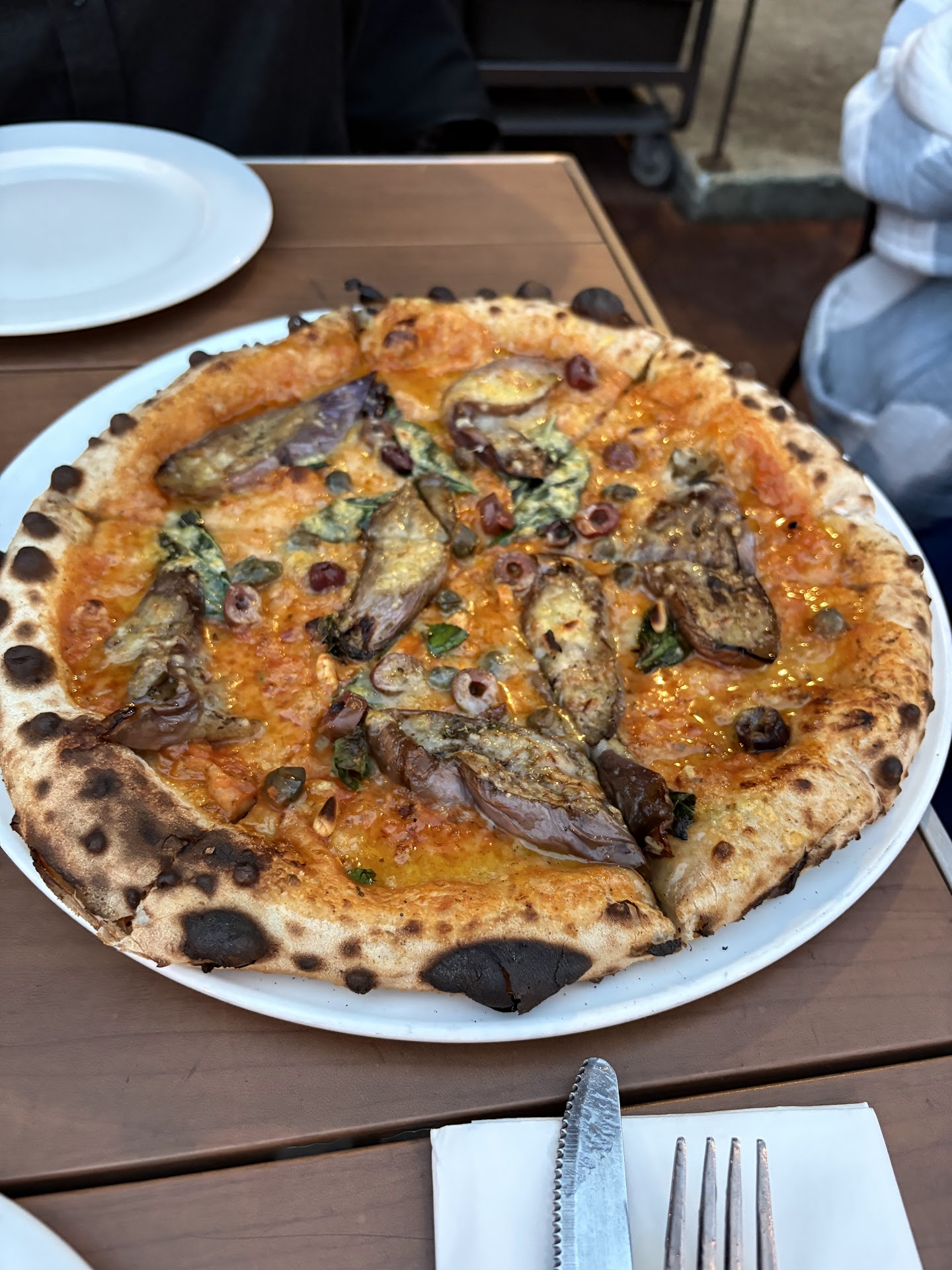 My friend and I split a Sicilian eggplant pizza and the tuna belly, both of which were phenomenal. The tuna belly was super flavorful and went wonderfully with the hearty starter bread; the celery leaves were a great final touch and pop of freshness to cut through the otherwise fatty, heavy dish. It was also the perfect way to whet our appetite for the pizza. The pizza was fantastic, with a great savory, slightly tart tomato sauce and a generous helping of smoky roasted eggplant. The crust has a great char and is quite thin and almost floppy, but it's to be expected for Neapolitan-style pizza; it just means you have to dig in pretty quickly or it'll start to get a bit soggy. The pizza is finally finished with a sprinkling of fresh basil and diced kalamata olives, which give the dish a good extra hit of freshness and brininess, respectively.