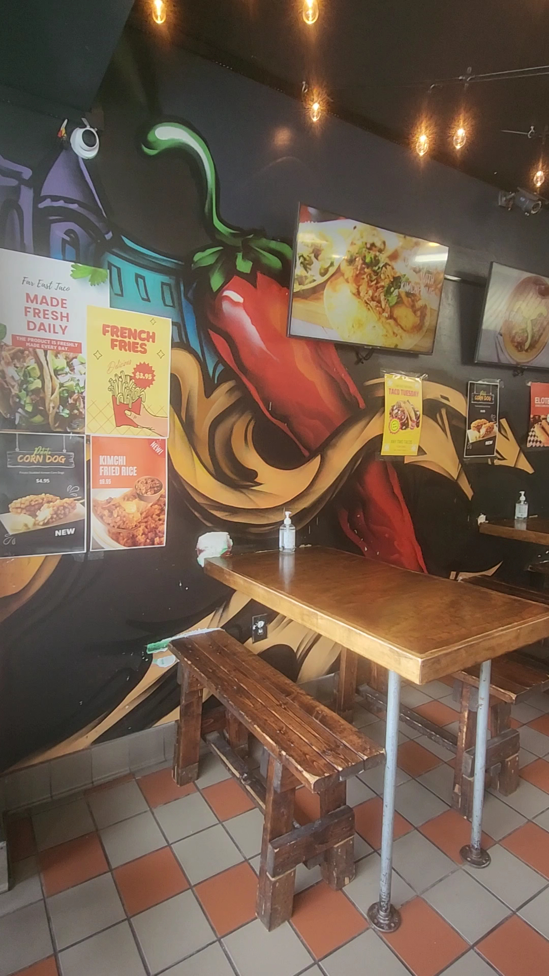Pretty straightforward, build your own taco, burrito, and maybe bowl, too? I didn't see. I ordered at the in person register. Then I saw there was a computer screen where I think you can also order. I probably should have done that because they did get my order wrong. Nothing crazy just asked for specific topping for each meat choice, and it was mixed up. And I was going to buy a drink but before I said something I was given my total. I also ordered guacamole 🔥🔥 really good! It was a shame the chips weren't too fresh. The first taco I ordered was shrimp with Pico ( but they put cilantro and onion), still a 5/5 and it went amazing with the spicy pineapple sauce. That was a winner! I still want to try it with the kimchi lime or Pico. 2nd taco was steak with cilantro and onion , I wasn't a fan of the meat. 2/5. 3rd taco was chicken. It had cilantro and onion, but I asked for the Pico on this one. Chicken was good, but you need to find the right toppings for it. 4/5 Over all 3/5. guacamole and shrimp taco saved this place for me. I won't be rushing back, but this is a good note to try things with different toppings next time. I think they should have a signature taco for each meat that people can pick from. Designing your own taco is cool, but having a go-to pick would help people fall in love with different items. Even having a taco of the day special. And for sure, chip and guacamole special so that more chips are getting ordered before they get stale. Gotta move product faster or order less inventory at a time. Price wise, I think it's automatic dollar too much for a taco. This place is right across the street from a university and on a busy street. There SOOO much potential with this place. Just gotta market and add a few things. Maybe even a student discount. This place is also in walking distance of thousands of potential customers, cheap beer might be a good add to this place. Aside from that, the place seem low key. And can seat like 15-20 people. It looks like they have room for outside seating. It's also on a corner, so I'd take advantage of that if they are able to. Next time im in town, I'll check out reviews and see if any changes have been made. So I might stop by again in the future to do a new review. Low rating isn't to say avoid this place. it's for the owners to make a few changes. Taco spots should be...