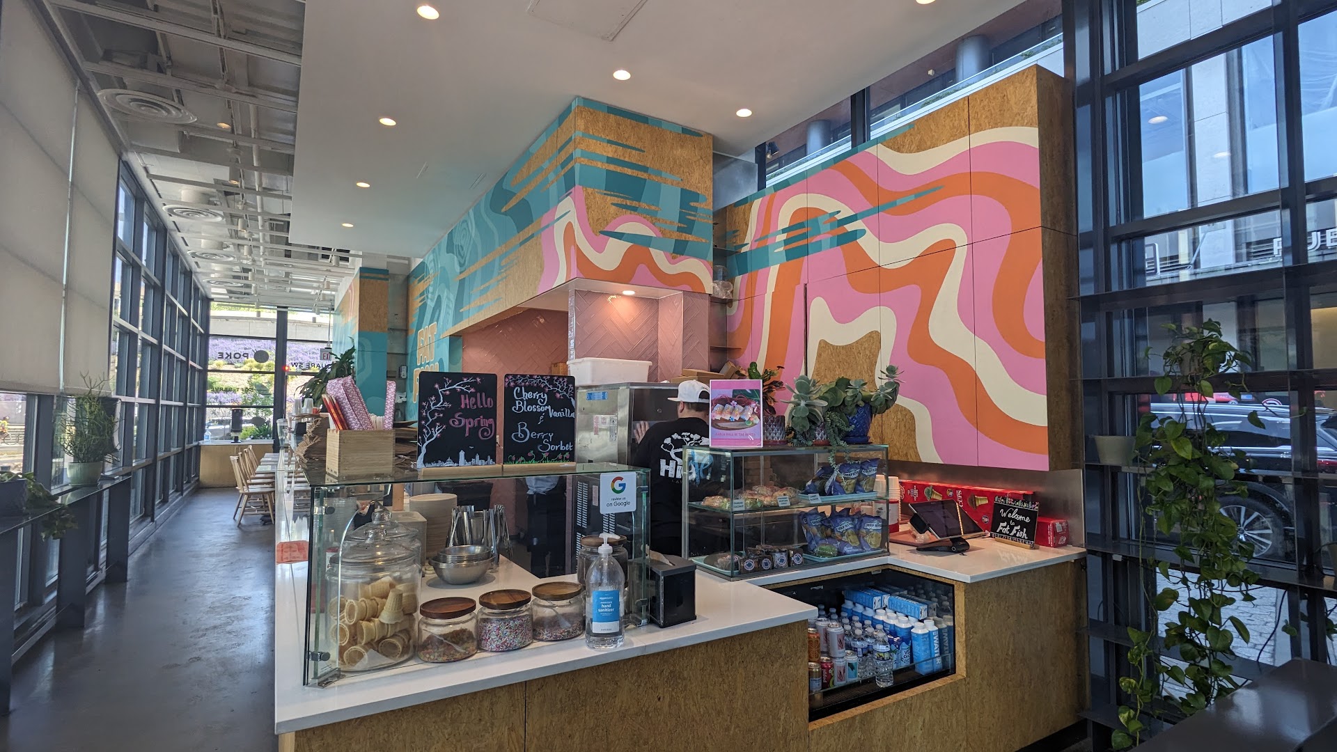 Logistics: there are 3 kiosks that you order from when you enter. One was out of service while we there. You can view their menu online and I think you can also order online but we did it at the kiosk. I chose to have my receipt printed but nothing came out so I just waited for my name to be called. At about 3pm on a Saturday (during DC's cherry blossom festival), they were busy (naturally so). The 3 staff members were making all the orders as fast as they could and were very nice. It took awhile to get our food but it was fine, we hung out and rested at one of the small tables inside. There was outside seating but it was raining so unfortunately it was all wet.