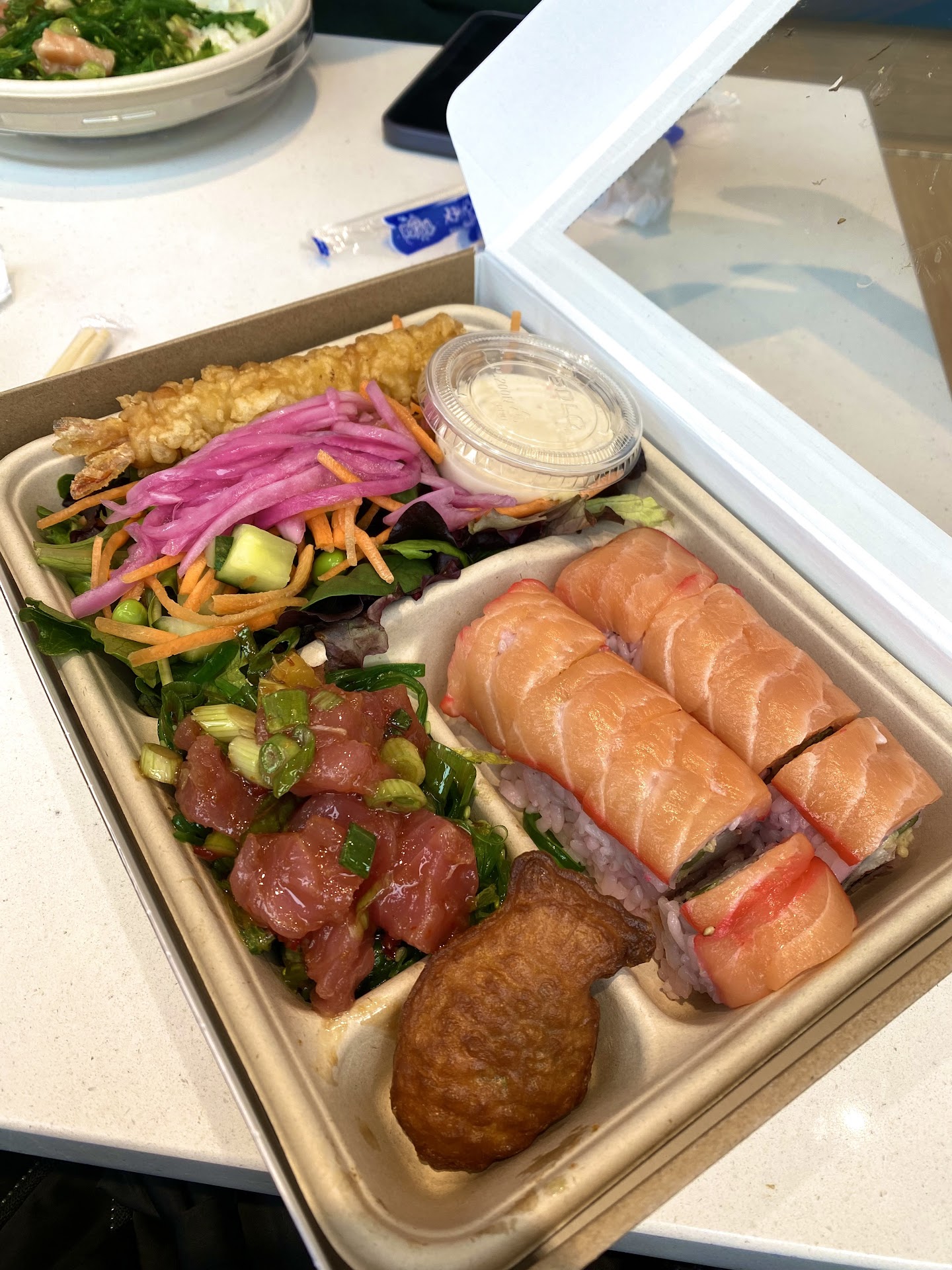 Read moreA quick break for linner ( lunch/dinner ) at Fat Fish with friends. We got poke bowls, sushi & the Cherry Blossom Bento Box (seasonal I assume). It had a crab meat roll covered in salmon with sakura rice (pink) with tuna poke over seaweed salad with a salad and mini taiyaki red bean fish. It was all very yummy.
