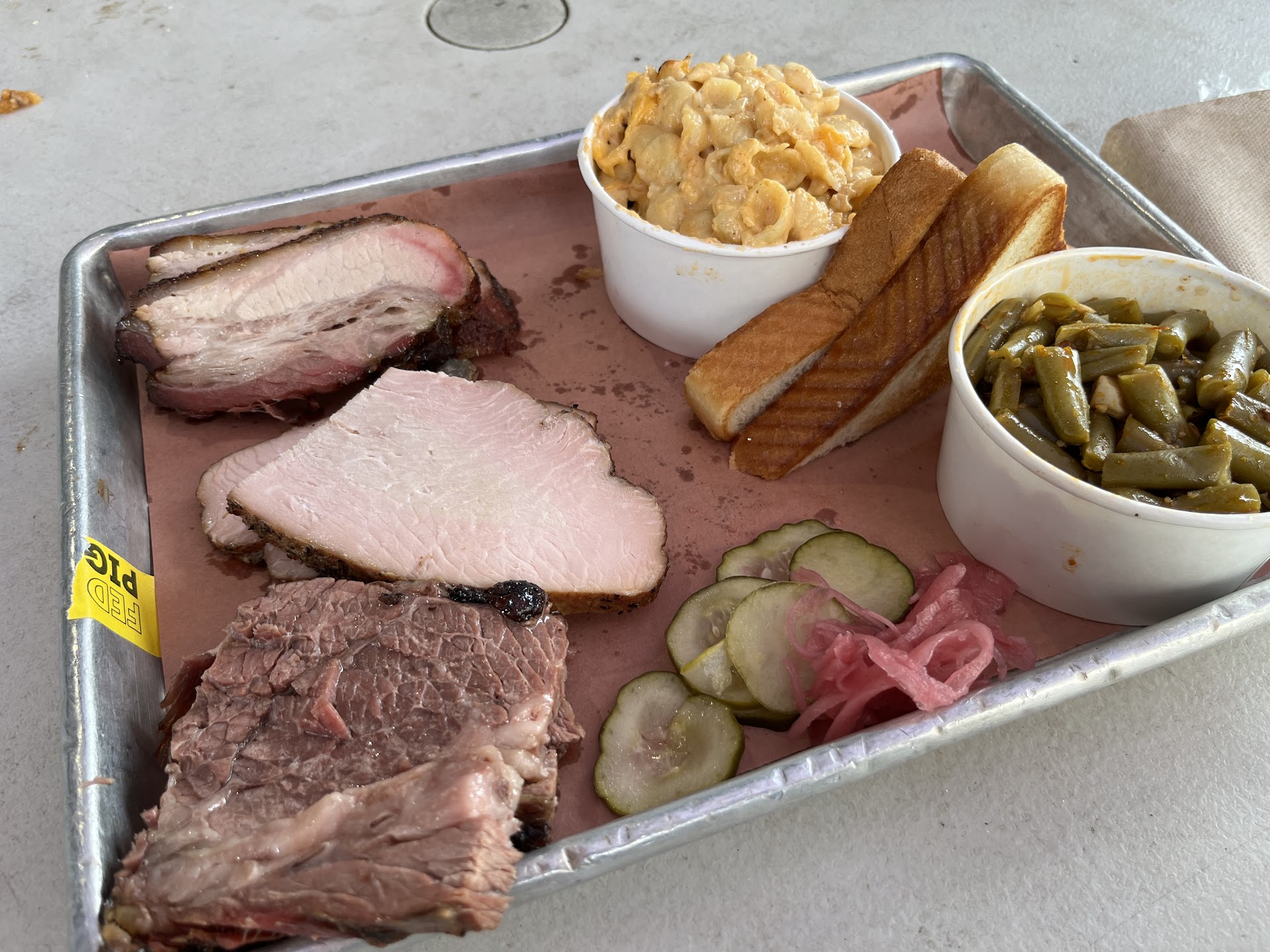 Read moreOn a recent business trip to DC I was craving Texas Style BBQ so I turned to the internet to find out my options. The Federalist Pig was pretty close to my hotel and the reviews were great so I headed over for lunch on a Saturday afternoon. The restaurant is a kind of "industrial" looking shack which looks great and there is plenty of outdoor seating. I arrived about 45 mins after they opened and was greeted at the door by a server asking if I was picking up a pre-order or placing an order. I was placing an order so I was provided a menu and told to let him know when I was ready. When I came to place my order the young man taking my order seemed very disinterested in engaging with me, never looking directly at me and rushing through my order. I ordered the 3 meat combo and chose Brisket (moist), Turkey Breast and Pork Belly with Mac and Cheese and Green Beans which ran $22.50. The food came out more quickly than I expected and was fairly well presented in the typical BBQ way, on butcher paper on a tray. Now, the food; the sides were both good and flavorful with the Mac & Cheese having a little bit of heat to it. The meats 'though were a little disappointing. The Brisket had good texture but no real flavor at all. There was no smokiness and no pepper kick that you expect from the bark of Texas Style Brisket, it tasted more like roast beef from the flavor stand point. I felt that the turkey was sliced to thickly and again it lacked any smoke flavor or seasoning flavor, but the texture was good and it was not dried out. The Pork Belly probably had the best flavor of the 3 meats that I tried, it didn't have a ton of smoke flavor but I could taste a little bit and the texture was good, it was nice and moist. Overall, I was disappointed and would not come back to eat here as the flavor, in my opinion, is the most important factor in good BBQ and that is where this was really...