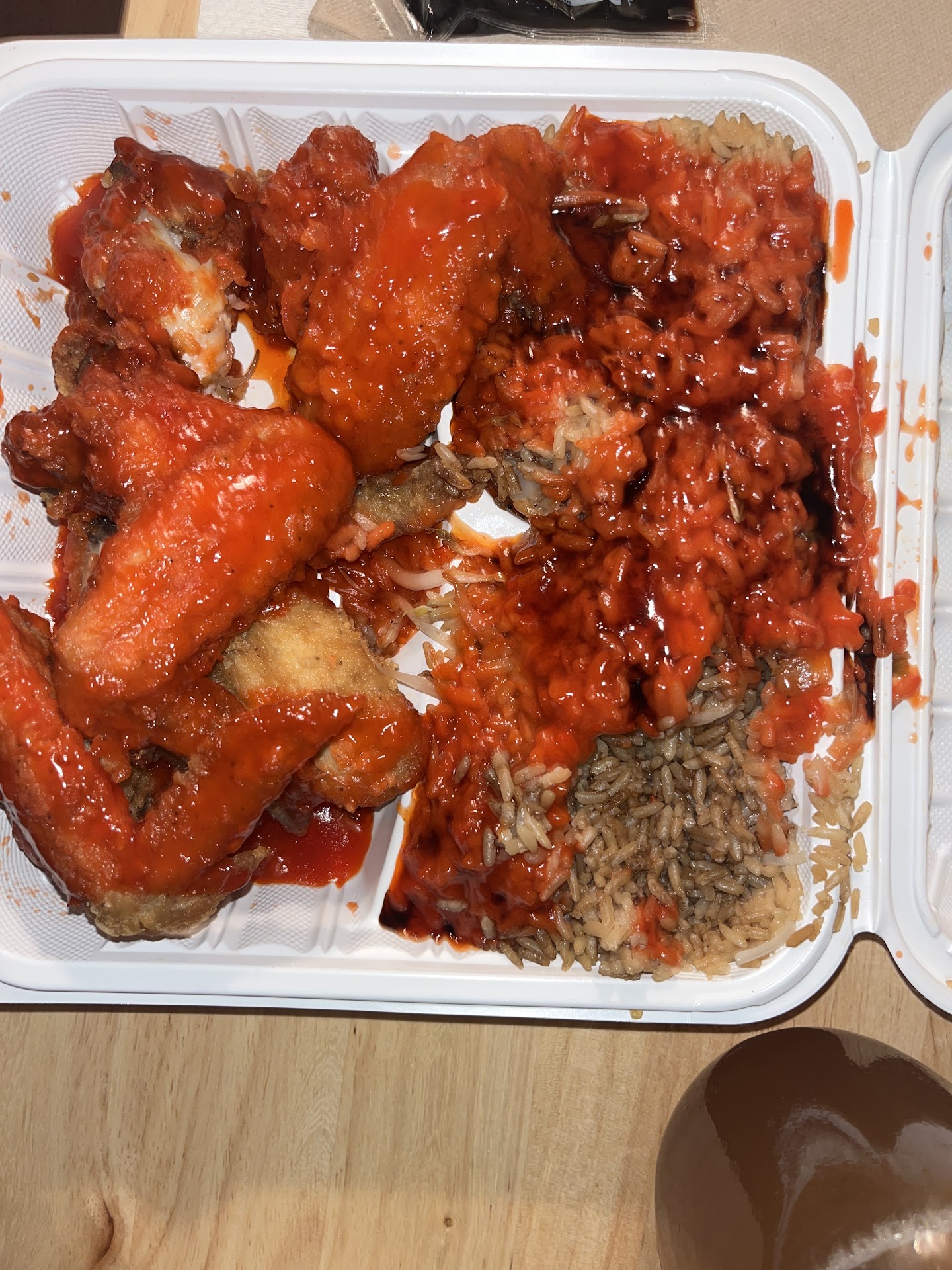 I purchase $23 worth of food-$9.00 for shrimp fried rice $13+ for fried chicken wings. I ordered the food as soon as they opened thinking the food had just been cooked. It was clear to me that it was leftover from the day before or the oil it was cooked in was weeks old. The shrimp were mushy.
