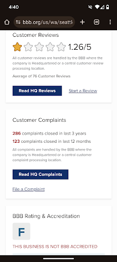 BBB Rating "F": when I went to start my round of complaints, I learned that this business is not accredited, they have one out of five stars on BBB, and the lowest rating I...