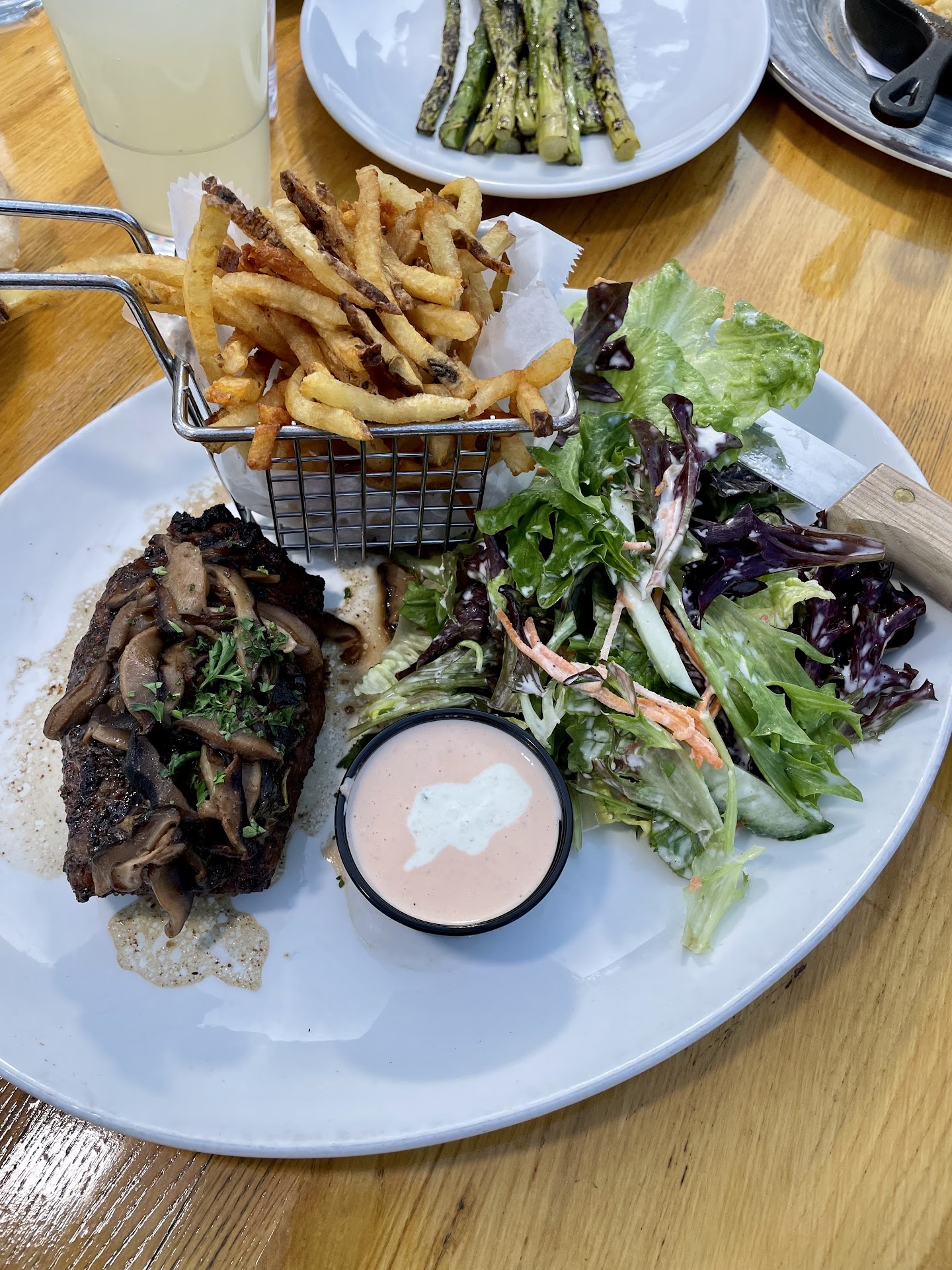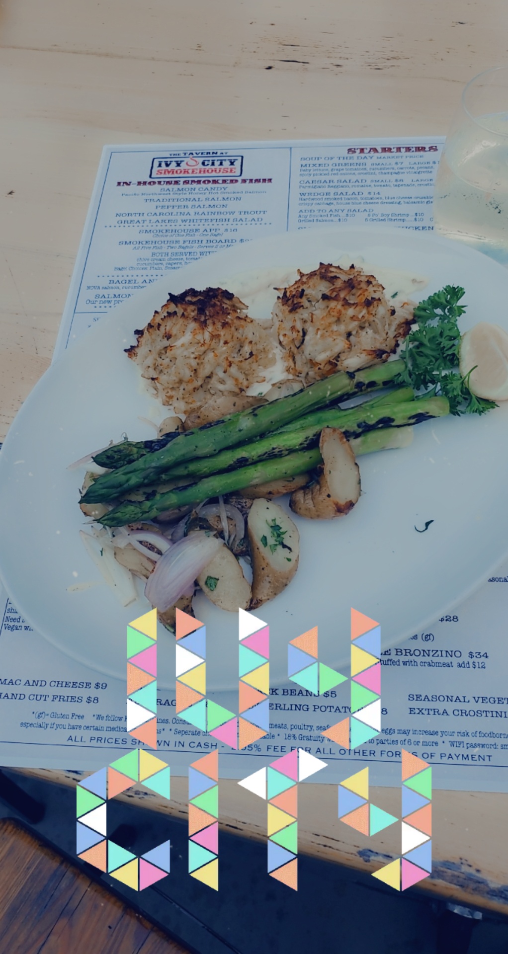 The crab cakes were AMAZING not skimpy not tricky style with fillers, I did have a few extra more bits of shell than anticipated, but I was able to get rid of them and still keep it cute, my asparagus grilled to perfection. It was not limp or overcooked. It was tender flavorful and juicy. And the one potato I tasted was great...(watching the carbs summer is almost here)). The Maryland crabcakes were actually worth a 2nd order but it was just day 2 in town and I was just getting started so I used restraint...( was back again there 2 days later like I never left. no rain, friendly faces and an AMAZING salad with candied Walnuts, spring mix, I believe gorganzola cheese..Smoked to PERFECTION wings and deliciousness that they called mac n cheese.. it had what tasted like a bit of spicy pimento cheese in it giving an added kick. Only had a few bites but savored every one. And the lemonade was extremely refreshing and ice cold. Service from all was great. The wings.... I should have gotten an order to go. The smoked flavor an seasoning was soo soo good. I'll DEFINITELY return, the menu has a few more item on it with my name on it. I'll be back before the summer ends.