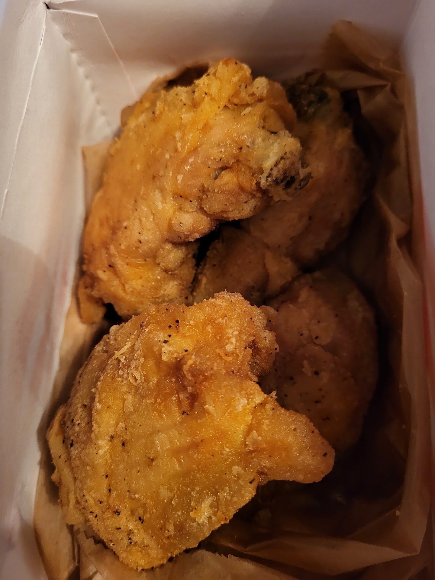 We ordered a 4-piece black chicken dinner with onion rings and okra. 🍗 The chicken is amazing! It's not like those fried chicken dishes with overpowering flavors; it's all about the delicious taste of the chicken itself. The meat is incredibly fresh and juicy. The only downside is their food box; since the food comes out hot, it gets a bit moist inside the box, which is probably why everyone enjoys their food in the parking lot. 🚗💨