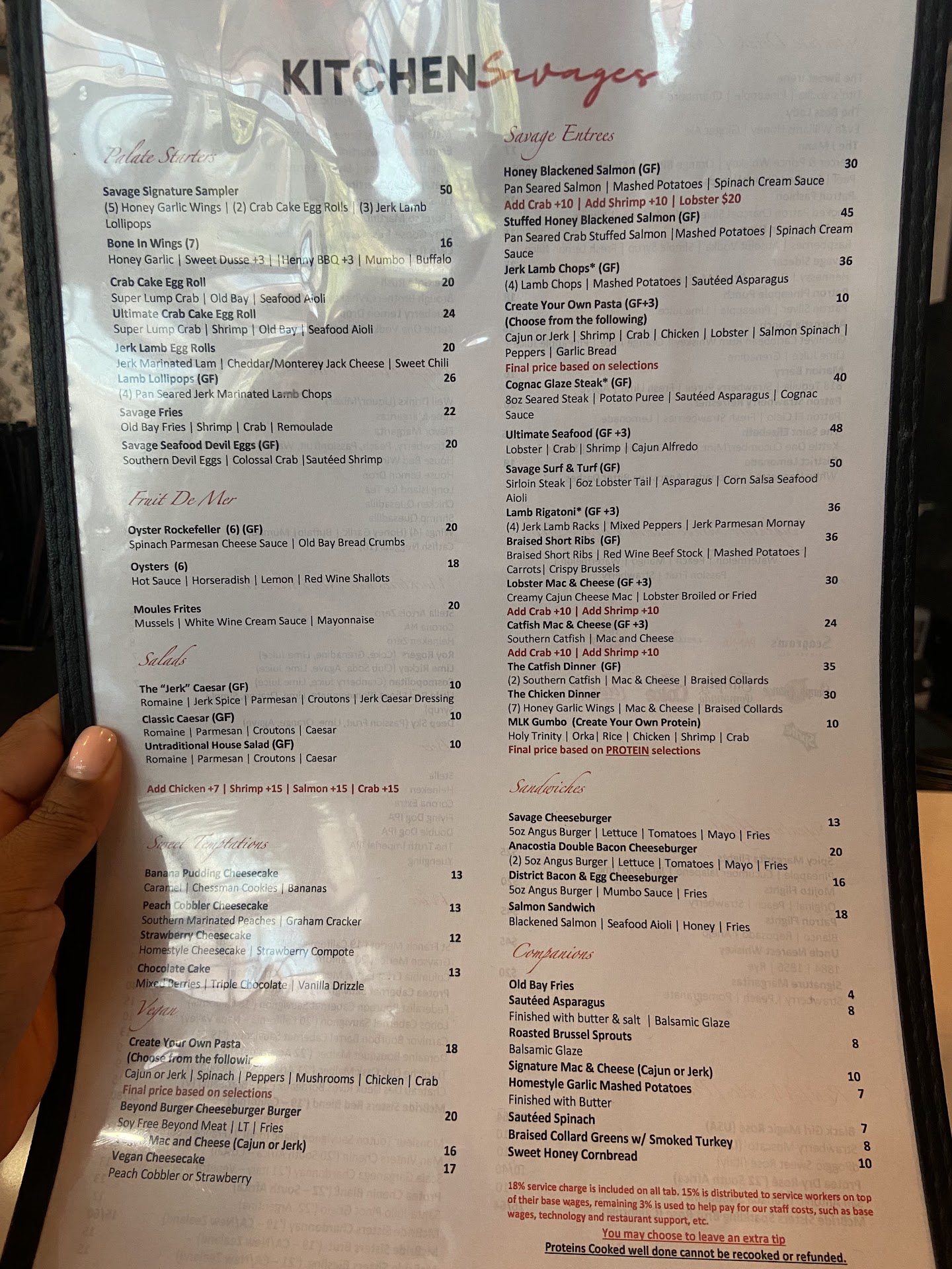 Things we ordered: Margarita Flight 9/10: 3 1.5oz patron tequila curated + flavored margarita drinks strawberry, peach, and pomegranate. All of which tasted refreshing and were very well mixed. Would love to see a sugared or salted rim. But still a delightful sampler French 75 10/10: FAV because he suggested floral Hendricks vs traditional. It was so good Crab cake egg rolls 10/10: 2 whole egg rolls cut in half (so 4ths) generously stuffed with crab meat seasoned to perfection with a drizzled seafood aioli sauce that complimented the appetizer so well!!!! Please order this especially all my crab lovers Asparagus with balsamic glaze 10/10: this asparagus could not have been cooked to a better texture and flavor. It was so good a nice buttery salty balance with the balsamic. A light roasting on the asparagus heads Garlic Mash Potatoes 8/10: on the menu theyâre described as home style and they are definitely made FRESH in the kitchen. You can taste every bit of the garlic yet itâs not overpowering. Light buttery finish. I personally like more butter BUT still tasty nonetheless Jerk Lamb w/ Jerk Alfredo Rigatoni 8.5/10: 4 petite lamb chops cooked to the temperature of your liking. Lightly seasoned but juicy served on top of a jerk Alfredo rigatoni with mixed peppers. So good a very healthy portion. The Alfredo sauce calmed the sting of the jerk seasoning but itâs so flavorful and robust!!! Some freshly grated Parmesan cheese or Romano cheese would have took this to the next level. But yummy. (this might be a brunch offering only) Catfish & grits (N/A) - my bestieâs dish so no rating from me. She said it was very fluffy and crunchy seasoned well. I did taste the grits and it had a chicken broth flavor. The Cajun cream sauce was good. A variety of vegetables like corn and tomatoes were present as well. Banana Pudding Cheesecake 8/10: A slice of cheesecake served with banana pudding on top and crumbled cheeseman cookies / freshly cut bananas. The cheesecake was light and airy my preference on texture! The pudding was your traditional flavor. It was good. The graham cracker crust was like moist lol and pleasing it wasnât dry/flakey!!! My favorite part because I wasnât not expecting that! & this received complimentary so we are so grateful for the kindness offered to us.