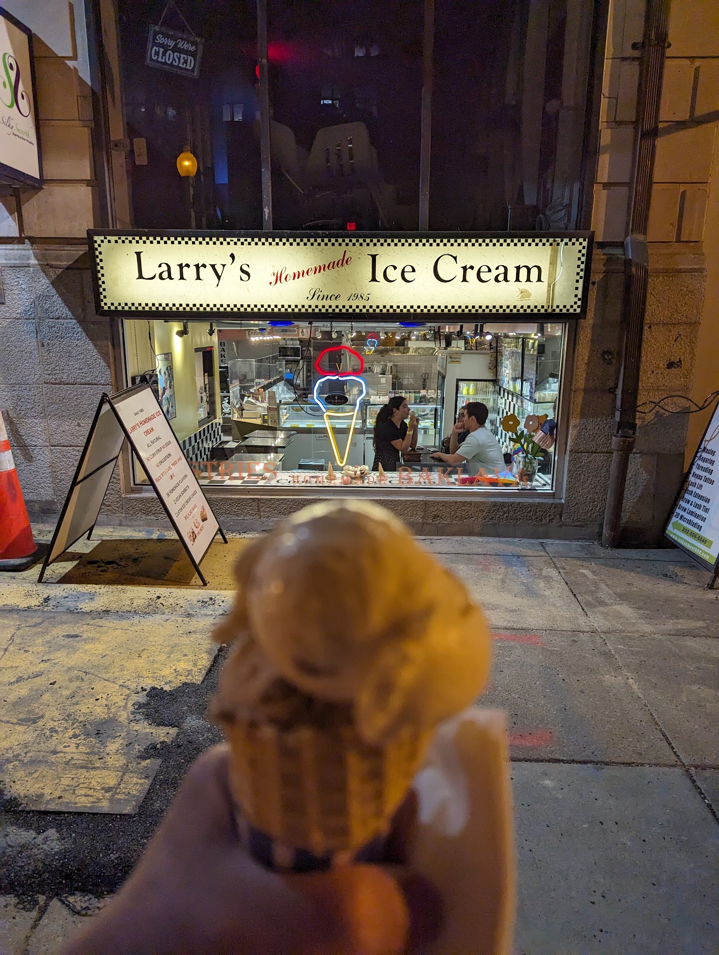 We stopped by Larry's after biking around and developing a hankering for ice cream. There's something comically charming about an ice cream shop in a basement, as well as it being called "Larry's," and indeed the workers inside charmed us with lots of affectionate names: "love, doll, sweetheart." They also said, "We're not supposed to give more than one taste" when I of course asked for a second taste and surely would have asked for a third... so maybe they have a point in their rule. Still, this was annoying. I wanted to taste a few options and get the one I liked best.