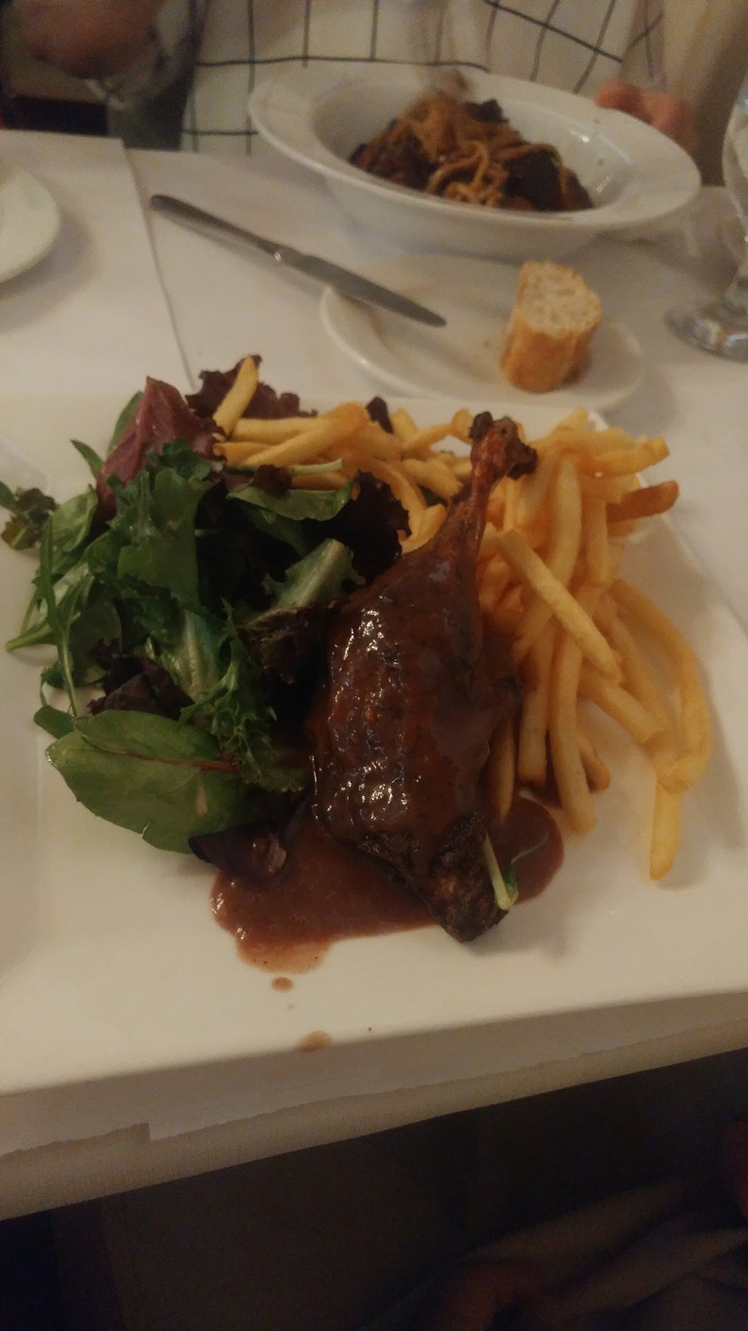 The food was excellent quality and a good portion size for the price. The NY steak was cooked a little more done than preferred, but still juicy and excellent cut of meat. The Canard Confit was very good and falling off the bone tender. The french fries were crispy and tasty. The salmon was delicious and served with an interesting and yummy spinach flan. The savory crepes were a good size for a meal and also delicious. For dessert, we had various yummy sweet crepes and the Tarte Tatin. The tart was really good, yummy and not too sweet. Also, the whipped cream was hand-whipped, not from a can or tub. I approve👍.