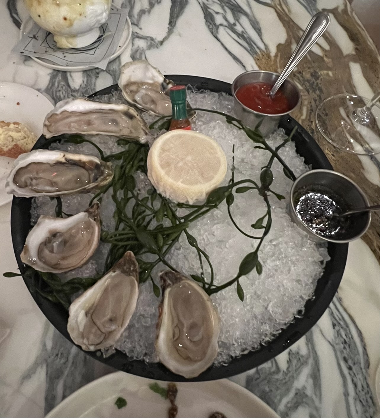 Food ā We ordered a lot and had plenty of leftovers. To start, we had French onion soup, 6 oysters, a leek dish and complementary bread. The oysters were super yummy, and the French onion soup was super delicious too! The leek dish was interesting as I think of leeks as a minor ingredient in a dish, but leeks were the featured ingredient. I enjoyed it though!