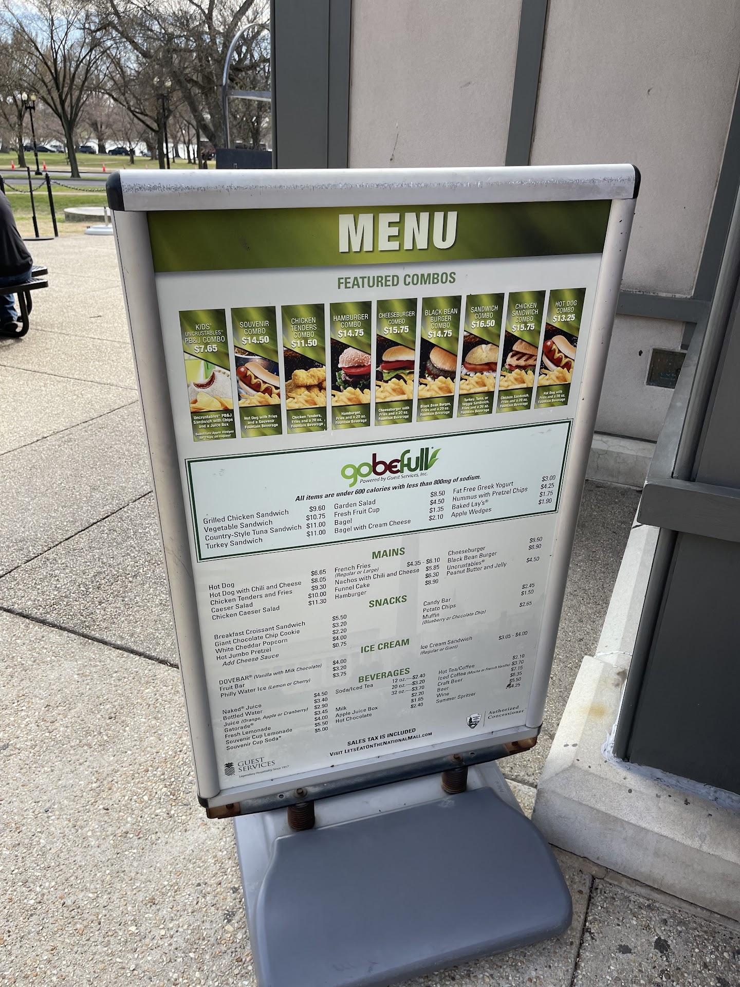 When you're visiting this area to see the Lincoln Memorial or any of the other beautiful monuments and parks, it is a long walk to the nearest restaurant, so it is nice that there is a place to get some food and drink. However, it is not that good. I ordered the Black Bean Burger and it was the worst burger I have ever had. The patty was completely dried out and as hard as a rock. The bun was pretty dry too and the thin fries were hard and lukewarm. I went back with the burger, which had probably been sitting under a heat lamp for hours, and to their credit they gave me a new one that was freshly made. It was still pretty bad, but at least this one was hot and I could actually bite into it. The mediocre food is pretty expensive too, but then again this is a premium location and the alternative is to go far for something else, so at least eating here saved us a lot of time. We probably should have just ordered some fruit or chips as a small snack instead of going with the...