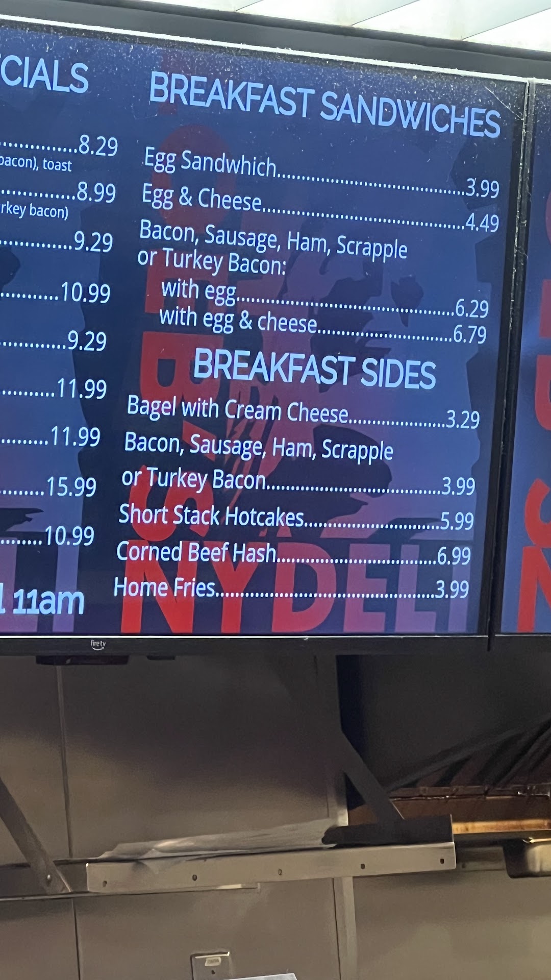 I got an everything bagel egg and cheese sammich with scrapple and a side of corned beef hash. The place was getting busy. My order came up in about ten minutes. Not too shabby. The cashier puts it in a plastic bag.