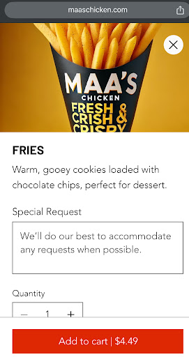 There are so many things wrong with this place and the red flags are all there. They were closed for months for health violations like poor lighting, flaking paint in cooking areas, inadequate water pressure, etc. But then their Instagram stated they were re-opening on a specific day. My coworkers and I were excited to try it out but when we went, it was still closed. Then it was nothing for months. No update on social media. No sign outside explaining anything. Just a dark store filled with random construction stuff. When they finally opened, the disappointment cannot be understated. The first red flag is all the AI-generated images for their menu and advertisements. Not only should that be concerning but it’s also misleading because the actual style of fried chicken is not like the images. The images make the chicken seem like southern style buttermilk flour crust fried chicken. Maa’s is more like burnt panko breaded chicken like an Italian chicken parm. The chicken fingers my coworkers got were super dry and salty. I went a few weeks later and it was a little better but not by much. The fries are clearly an afterthought. Probably a frozen bag they get from somewhere else then just re fry and douse in salt. By the time you start eating, the fries are completely limp. The sandwiches are a fraud too. Again, the menu images make it seem like you’ll get a big fat chicken thigh or pounded breast as the patty. Nope. Just two chicken fingers shoved into the sandwich. The bread was decent though.