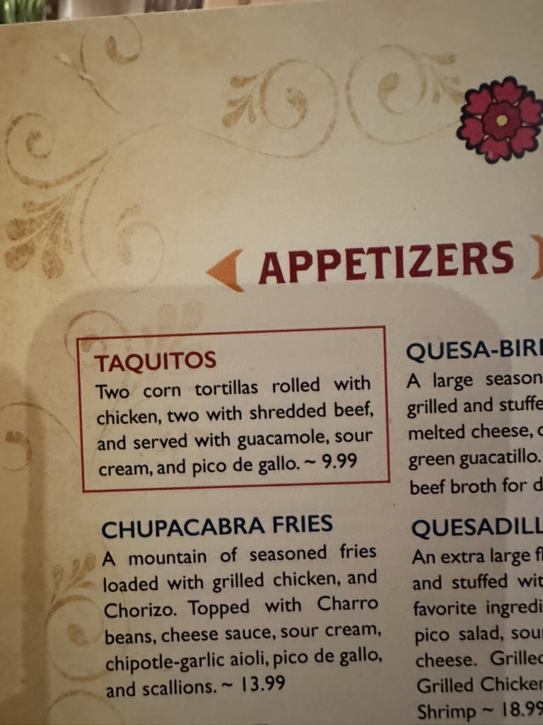 Service The service had room for improvement and is the main reason i deducted a point. A miscommunication around the Taquitos order left us disappointed. The menu described it as "2 chicken, 2 shredded beef," so we assumed we were receiving 4 taquitos. However we only got two and when we asked for clarification, they argued bit that it was clear and then admitted that it was a typo but didn't offer any resolution aside from a quick apology - no discounts or additional taquitos, nothing. This response was underwhelming and put a damper on our experience. I included a picture in my review so future diners can know what to expect. Aside from this, the service was fine, but we were hoping for a little more attention to customer satisfaction.