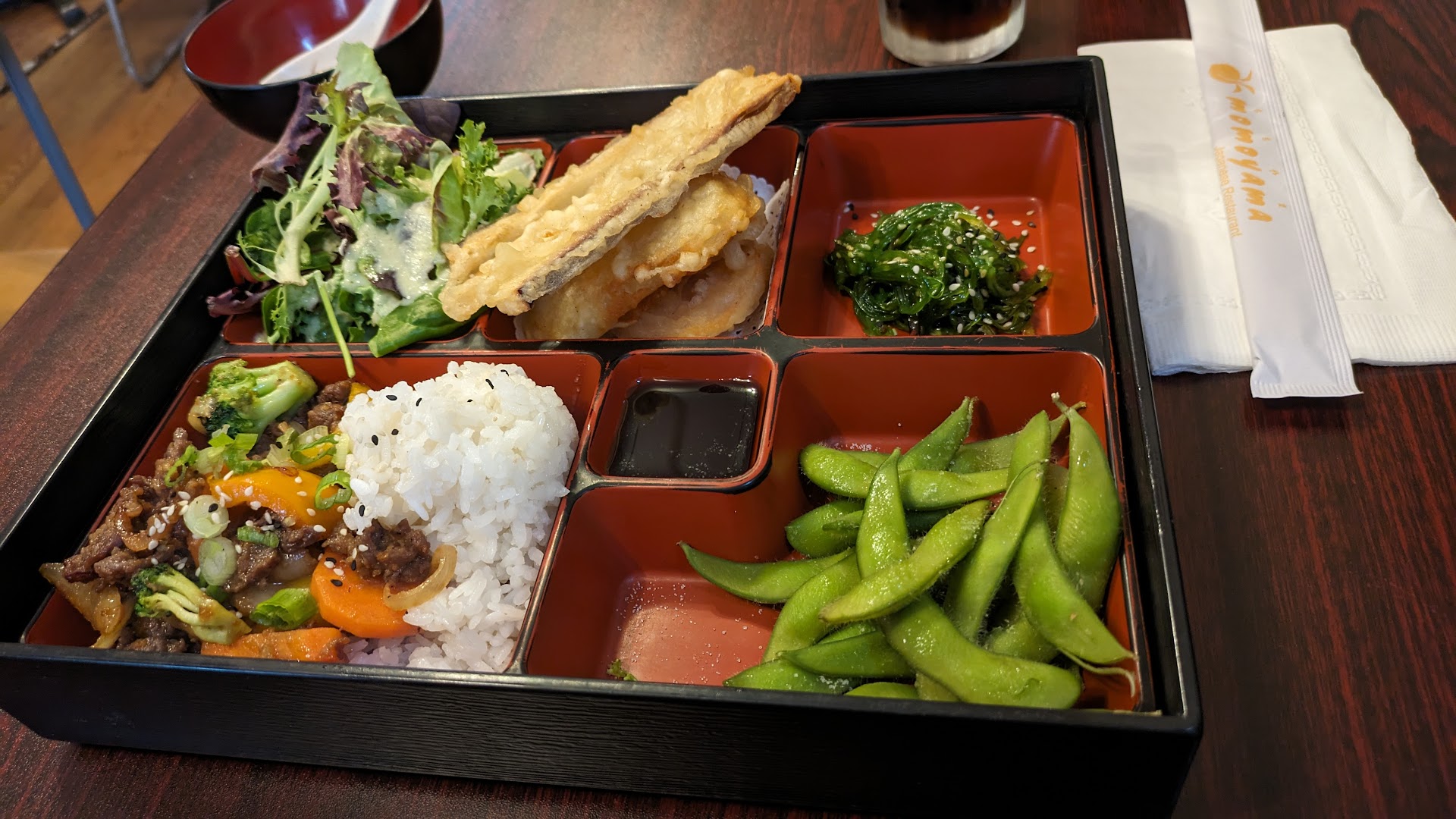 I ordered the bulgogi box, which is a shaved marinated beef on rice, with sides of miso soup, veggie tempura, edamame, and salads of lettuce and seaweed. That sounds like a lot, but unfortunately for an American male from the west, it left me hungry. Maybe the issue is that I ordered a box instead of a rice bowl, but looking at pictures I'm not sure that's true. In hindsight, I should have supplemented with some rolls, but I didn't realize how small the box would be.