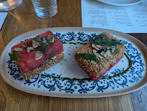 Drinks: It's an impressive list of cocktails using ingredients from around the Mediterranean Sea and wines from the region. If you love a tad sweet, order the Beet's Knees or the Namak 75. My friend enjoyed the white wine from Palestine.