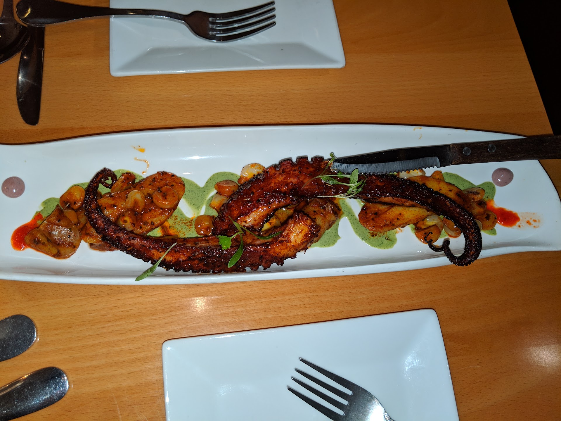 Their ceviches are well-known, but we settled on short-rib antichuchos for a shared appetizer. The short ribs are marinated for 72 hours in an aji panca honey glaze and served with a creamy huancaina sauce, fried yucca, fingerling potatoes, and purple cabbage. The ribs are so tender they fall right off and paired with the various sauces, cabbage, and potatoes, it's one heck of a dish.