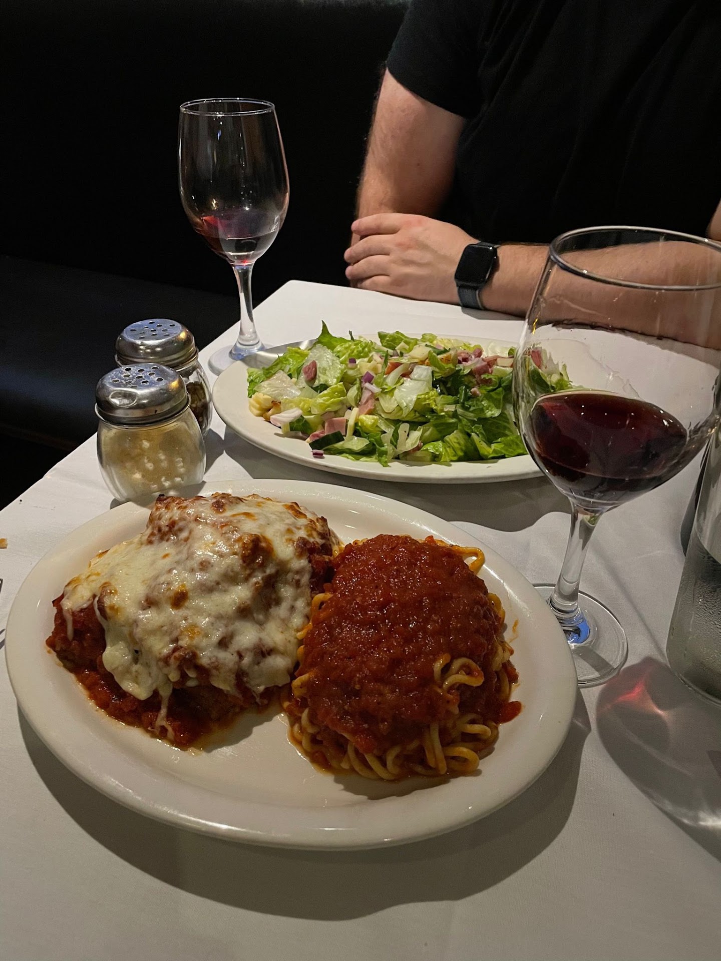The main course we split the veal parmigiana and a salad. The portions are generous so it was perfect to split. The veal parmigiana was perfectly breaded and fried thin pieces of veal layered with mozzarella and red sauce and served with spaghetti. It was delicious!