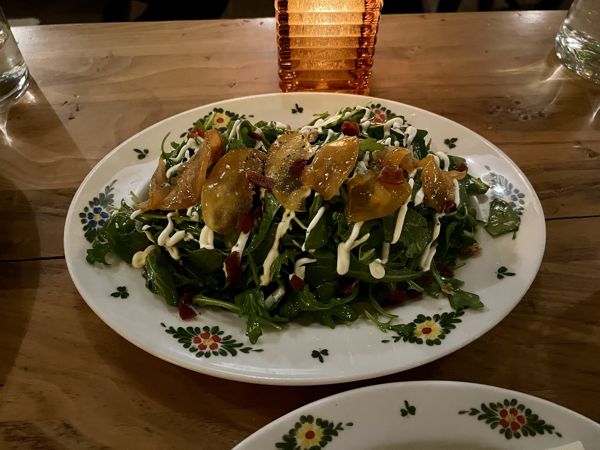 We started with the trout spread, which came with warm, slightly chewy crostinis. I'm not one for crostinis, generally, but these were delicious in their chewiness and warmth, and worked well with the spread. The portioning felt fine for $5. We also shared a plate that had two cheese and one pâtÊ. None were particularly thrilling, but all were quite good. The serving size of the cheeses felt disappointing for the price, but I suppose that's what happens with a cheese plate at a fancy restaurant. The serving size of the pâtÊ was fine.