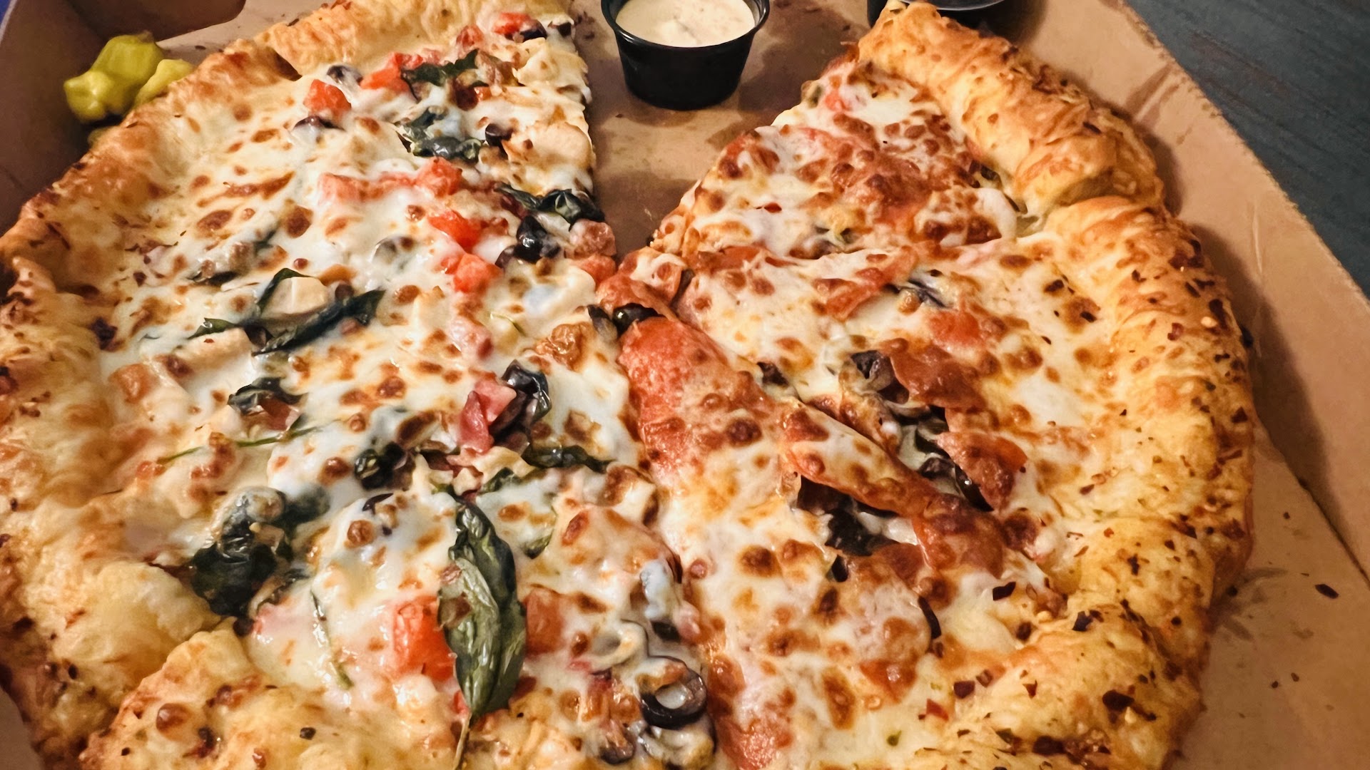 Thisā¦. Is Thee best Papa Johnās pizza Iāve ever seen or eaten!!!!! Five Stars! I donāt remember the gentlemanās name that made, cooked, and handed me this pie (carry out on 10/3/23 6ish pm), but thank you so much! I donāt give out 5 stars frivolously. Iāve ordered this pizza the same way so many times from so many places in different cities and states cuz I travel a lot for work and this is the first time itās been just perfect. I asked for well done⦠it is cooked perfectly well done, The crust is nice and brown but not burnt, the red pepper flakes are dispersed nicely across the entire crust, The width of the stuff crust is almost the same exact width around the whole pizza, the toppings are very nicely portioned and spread out, the pizza is actually cut all the way through, all the slices are exactly the same size, itās cut perfectly down the middle with not a single topping from one half on the wrong side (I ordered a split pie: half pepperoni, black olives/ half spinach, roma, chicken, bacon, black olives), he even has a few pepperonis, spinach leaves peaking through the cheese so they got nicely browned and theyāre crispyā¦. What more can I say about this pie? I guess Iāll find out as I bite into my second slice. Thank you, thank you, thank you⦠You are a magical mad scientist pizza wizard š š§āāļø and this is a delicious...