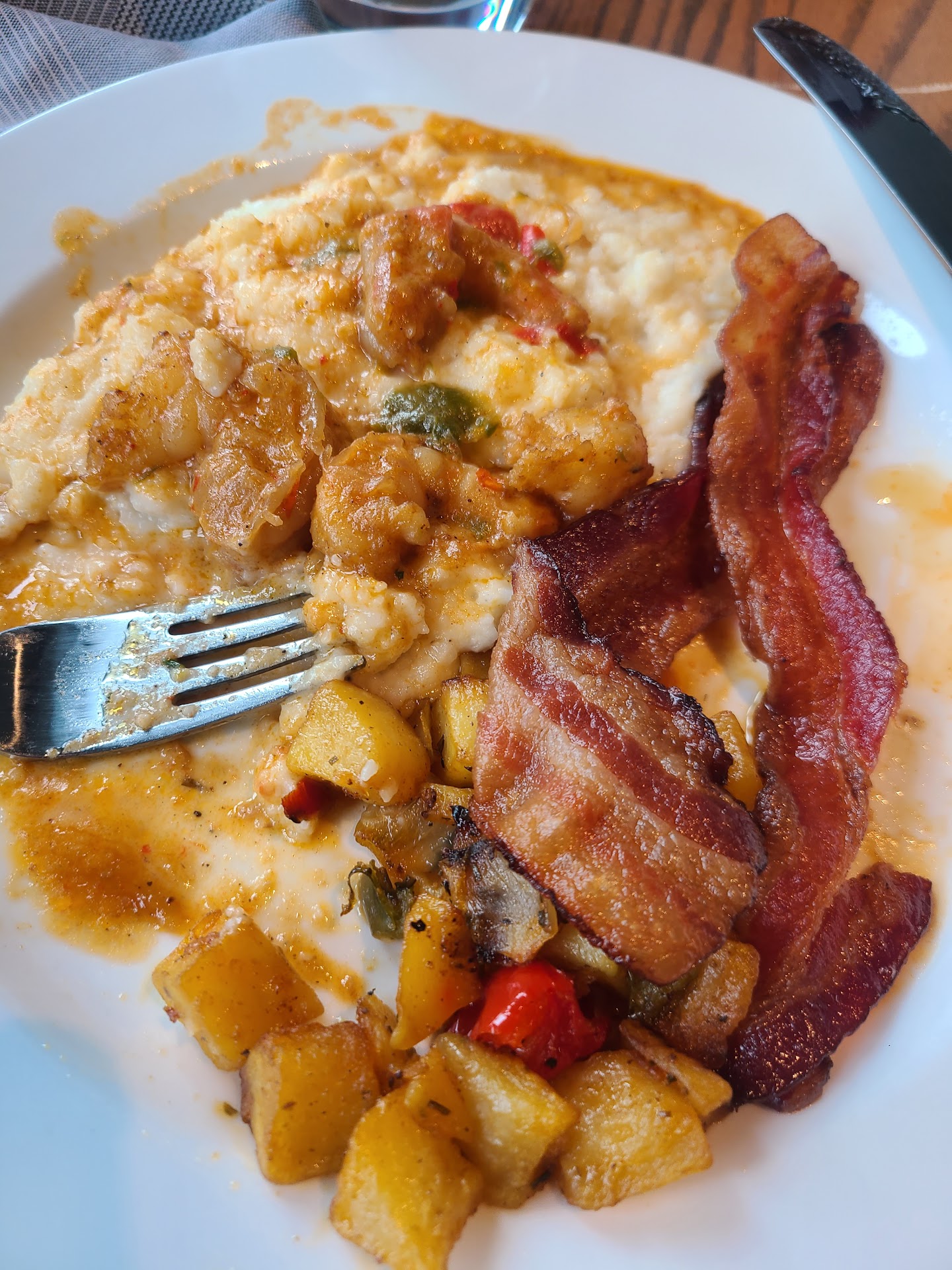 Read moreWe ate here for brunch. It wasn't bad per se but I can't say I am eager to get back. The cost of brunch is $45 and it just doesn't feel like a $45 brunch experience. It is buffet style. On the buffet was bacon, scrambled egg, turkey sausage (which tasted like microwave links), fried chicken, fried fish, shrimp & grits, pre-made waffles, french toast, a tossed salad, and yogurt. All the food was cold. Not warm. Flat out cold. This included the shrimp & grits and fried fish. Now I will give them credit on service because our server is the only reason Im even giving 3 stars because he was great! Eventually they put new sterno warmers under the pans to warm the food which didn't work well considering the food was legit cold by this point. Once they actually put fresh shrimp & grits out they were very flavorful and good! The bacon was also good. The french toast was decent but could have been great if not cold and burned. The small non burnt pieces had really good flavor. You can add bottomless mimosa, margaritas or bloody marys for $25 which...