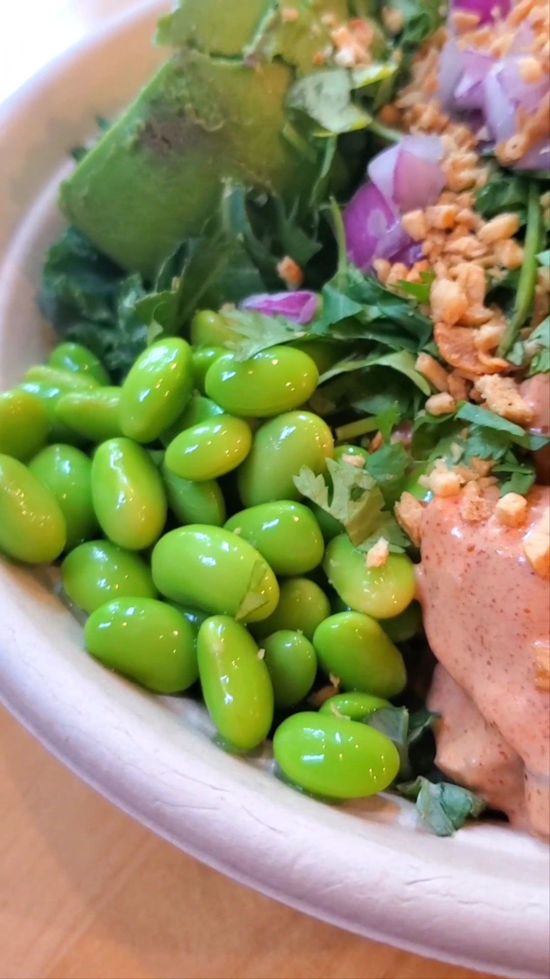 What's in it: Mixed greens (or rice) + spicy salmon (it's sushi, if you're new to poke [POH-kay] bowls) + fresh avocado slices + sides and toppings you wish. I like adding Seaweed Salad, Edamame, Cilantro, and a sprinkling of Fried Garlic. Great meal! 🤌 Keeps you fed, satiated for several hours with clean energy, and is delicious! It's light but filling and is refreshing with its mixed greens.