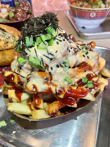 Their Trolley Fries (hand cut with kimchi, cashew cheddar sauce, cilantro, Korean ketchup, scallions, & togarashi mayo $8). STAMP!! Fresh crispy fries, delectable savory toppings!!