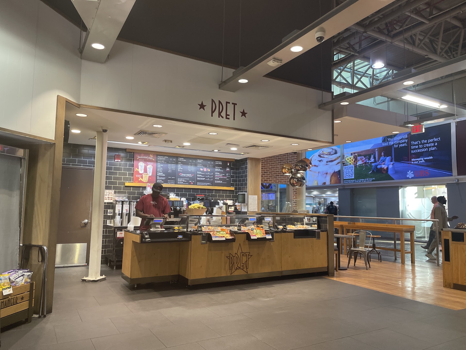 I had stopped in at 7:59 am on 2/21/2024 to get sandwiches for a train trip. I saw on all the packages that with a Pret Club membership, you save 20% off full price. I thought this was a great deal. Love the food at Pret, though it turned out to not be a deal. Before buying my sandwiches, I enrolled in the Pret Club, made my purchase, showed the QR code for the discount, paid $39.50. I realized I didnāt get my receipt, went back, was told I had to ask for it. LAZY answer by Pret employee. Got the receipt, went back to my table and looked for the discount, and there was none. I went back again and asked why there was not discount. The employee said looking at my receipt that you have to front load $40/monthly to get the discount. Honestly I was angry as I wouldnāt have bought from here for the trip. FALSE ADVERTISING. As I was back at my table putting the sandwiches away, a 250 lbs Pret security person comes up to me asking questions. He was actually intrusive and I cut him off as he was crossing a formal line of how to interact with customers. The guard then started to question my traveling companion and I cut the guard off again as he had no business interacting with them as they didnāt make the purchase. The guard then started to infur he didnāt mean we were gay, and I this point it makes no difference what a customer is. I said to the guard we were leaving and regret having made the purchases at Pret. I send a message to Pret and Pret isnāt concerned about lying to customers when they show a lower price without fully disclosing how to get it. It was more concerned by the fact that their guard was interacting with us in a terrible manner. Look at Pretās prices and a sandwich isnāt worth $11.00/US. Pret has lost a customer for life. I used to eat at all their locations globally. Great food, but false advertising and higher prices isnāt how they woo customers. Good bye you overpriced French...