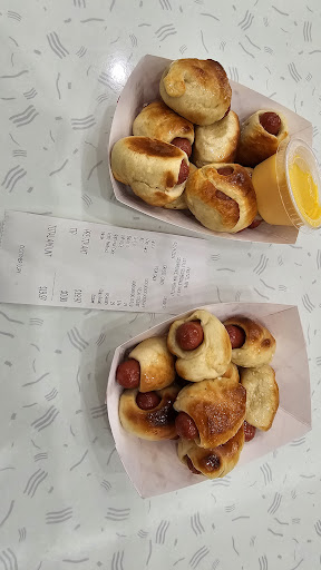 Pretzel Maker offers various items, full-size pretzels and pretzel bites with several flavors, pretzel and mini pretzel dogs with numerous dipping sauces, and different flavor lemonades, and I believe I read smoothies as well!
