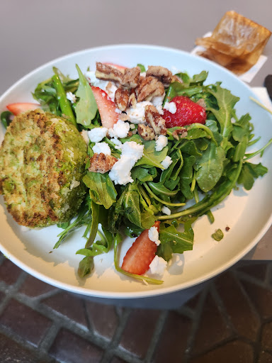 Entrees: The arugula salad has vegan feta, strawberries, candied pecans, and chopped asparagus; I added on the vegan lemony pea patty to my salad. The salad was divine, everything imperative in salad: crunchy elements, creamy, tart balanced with sweetness. It was full of flavor and such a chorus of harmonious parings.