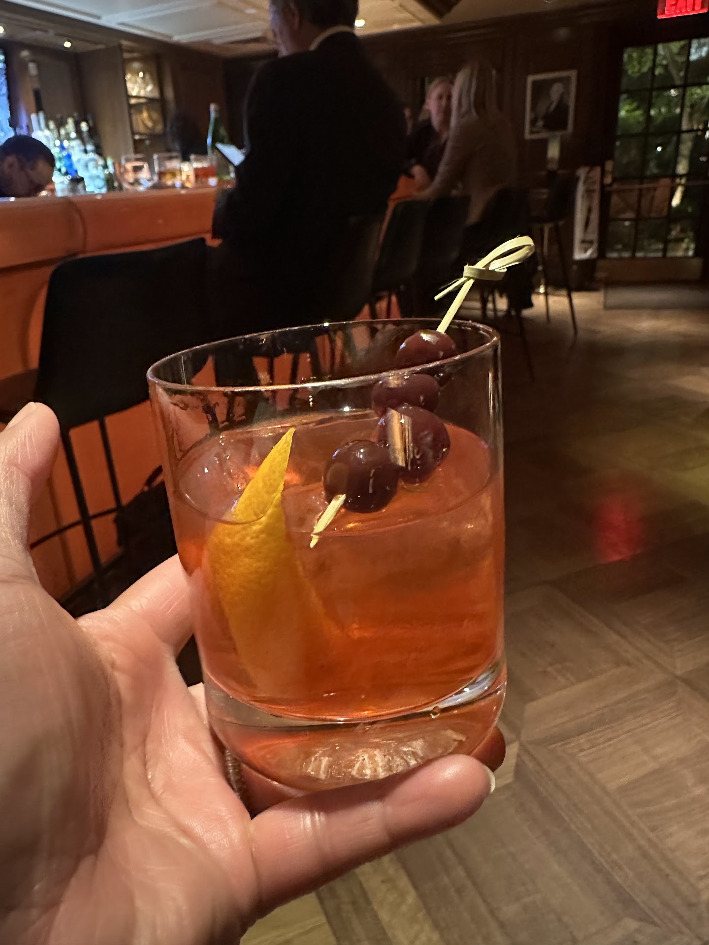 Quill is actually a series of small rooms. The actual bar itself is a gleaming molded curved glass lit up in an amber hue, a modern touch in an otherwise old-school room. Quill's dark wood walls gives off that traditional, sophisticated feel. You can also sit in the parquet floored lounge, where 18th-century maps detailing Jefferson's wineries and circular mirrors line the walls and a baby grand piano sits eagerly (they have a pianist that plays Tuesday through Saturday). There is also what's called the Book Room which has a fireplace and sofas and you're surrounded by leather-bound books on Jeffersonian subjects. The Book Room is big enough to accommodate 30 guests. Lastly, across the hall from the main bar room, there are the East and West Jefferson Cabinet rooms which are small, semi-private rooms with discreet pocket doors that can accommodate a small group (4-5 max seated). The rooms have a sofa, armchair that is a replicate of Jefferson's favorite armchair at Monticello, and a hidden flat-screen TV that pops in and out with a press of a button.