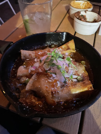 Drinks were probably the best part. Salsa was a bland pico de gallo and the queso seemed more like their own spin on the classic more like the Mac and cheese type of cheese . What rubbed me the wrong way was that the menu items did not match the descriptions. I ordered the brisket enchiladas which was supposed to be like good Texas BBQ from how it was described but the meat was pulled and just bland and there was no chili gravy. My wife fared worse as the veggie enchiladas were missing about 90% of the vegetables and had some corn niblets and a slivered slice of zucchini. When politely asking the waiter he took the dish back and then brought the same dish to us back from the kitchen saying that that’s how it was when clearly they were out of ingredients . He then mansplained to my wife which mind you is from Texas about what a enchilada has in it . Like dude you clearly don’t know your menu . No apology and no hey can we get you something else this corn thing sucks oh yes we don’t have vegetables tonight. I get having a bad day but it must have been very bad, we were nice we weren’t a Karen it sounded like it was the first day anyone ever worked at a restaurant which I know that was not the case . The quest for great tex mex continues , just wanted this to be documented it was not as advertised and...