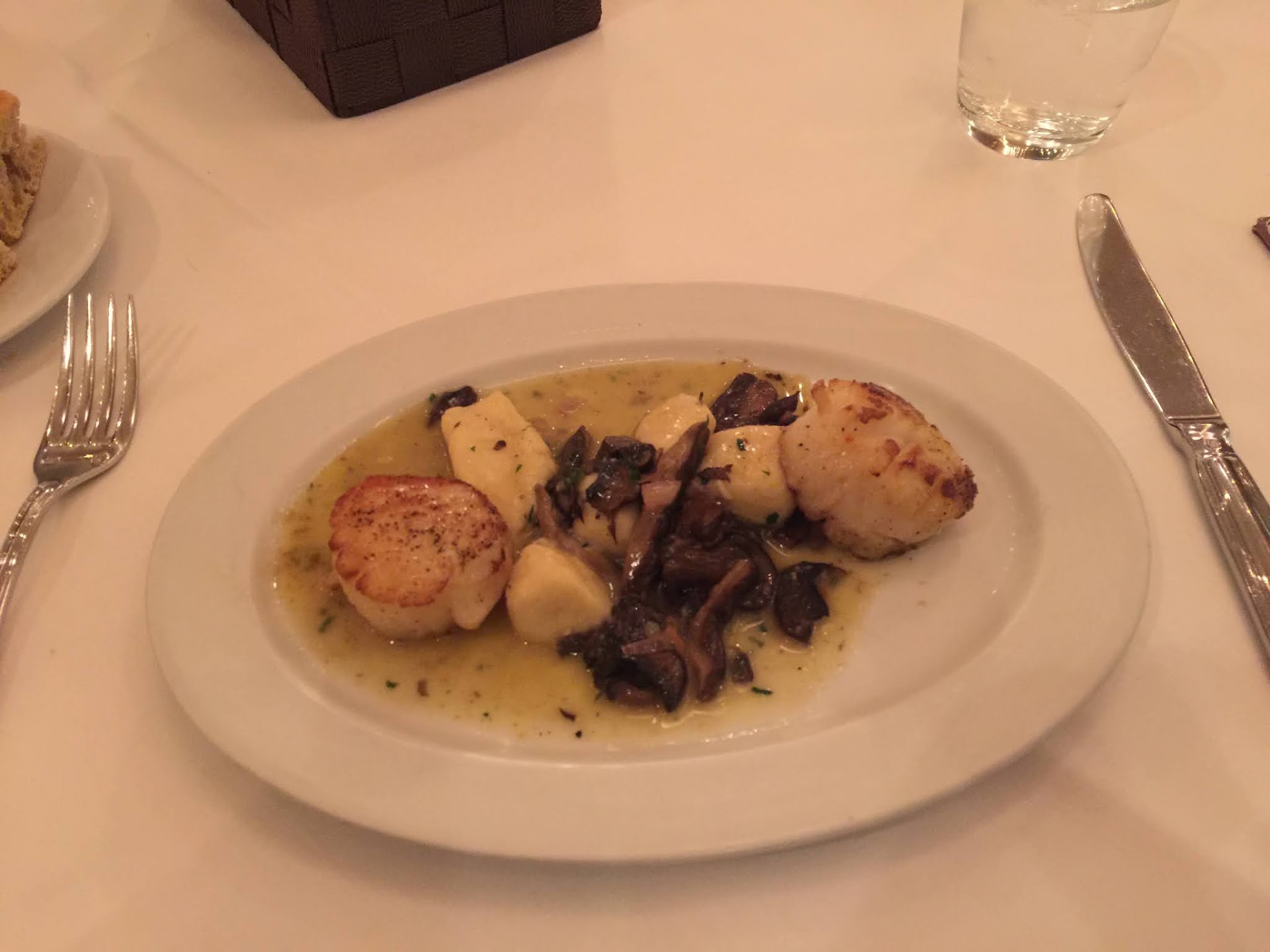 Earlier in the night we saw someone carrying several coats, but we were never offered any coat service. Our table was crammed and my chair seemed to be jutting out too far into the walkway and in the way of the wait staff. Our waiter was nice but service was slow. We ordered the marinated colossal shrimp as one of our entrees. Let's just say that they should mention that this dish is composed of only 3 shrimp and 4 slices of grilled pepper and onion. For $36, this was a disappointingly paltry amount of food. The chicken we ordered by contrast was a solid (but dry) half chicken that we couldn't put a dent in. The highlights of dinner were the bread basket, the caprese salad, wild mushroom appetizer and home made spaghetti.