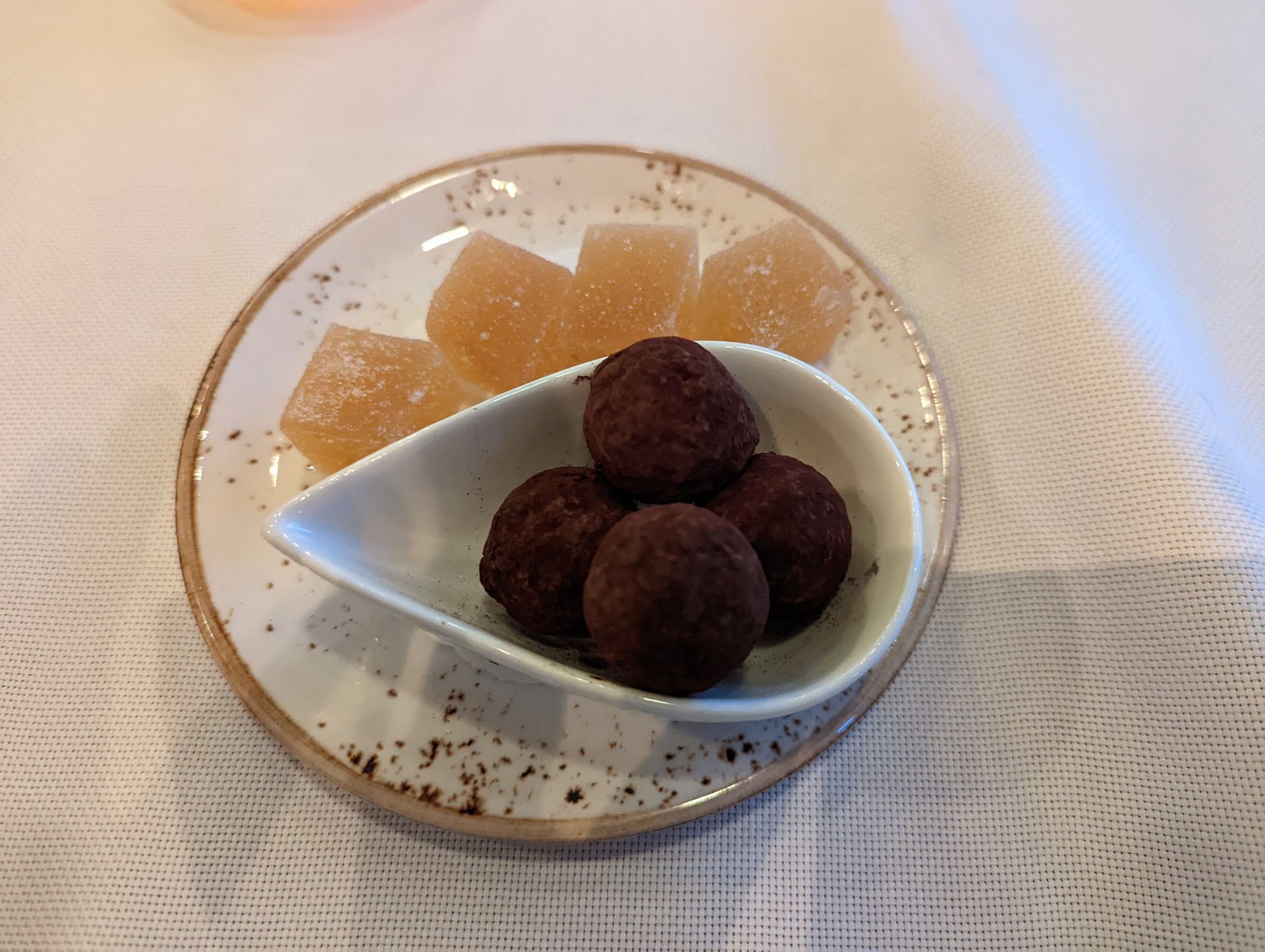 Final course was a dessert flight. Most of it was good except for the fact that I nearly broke the serving dish trying to break a -meringue- with my spoon. I don't know when that was made but they might consider removing concrete from the stand mixer.
