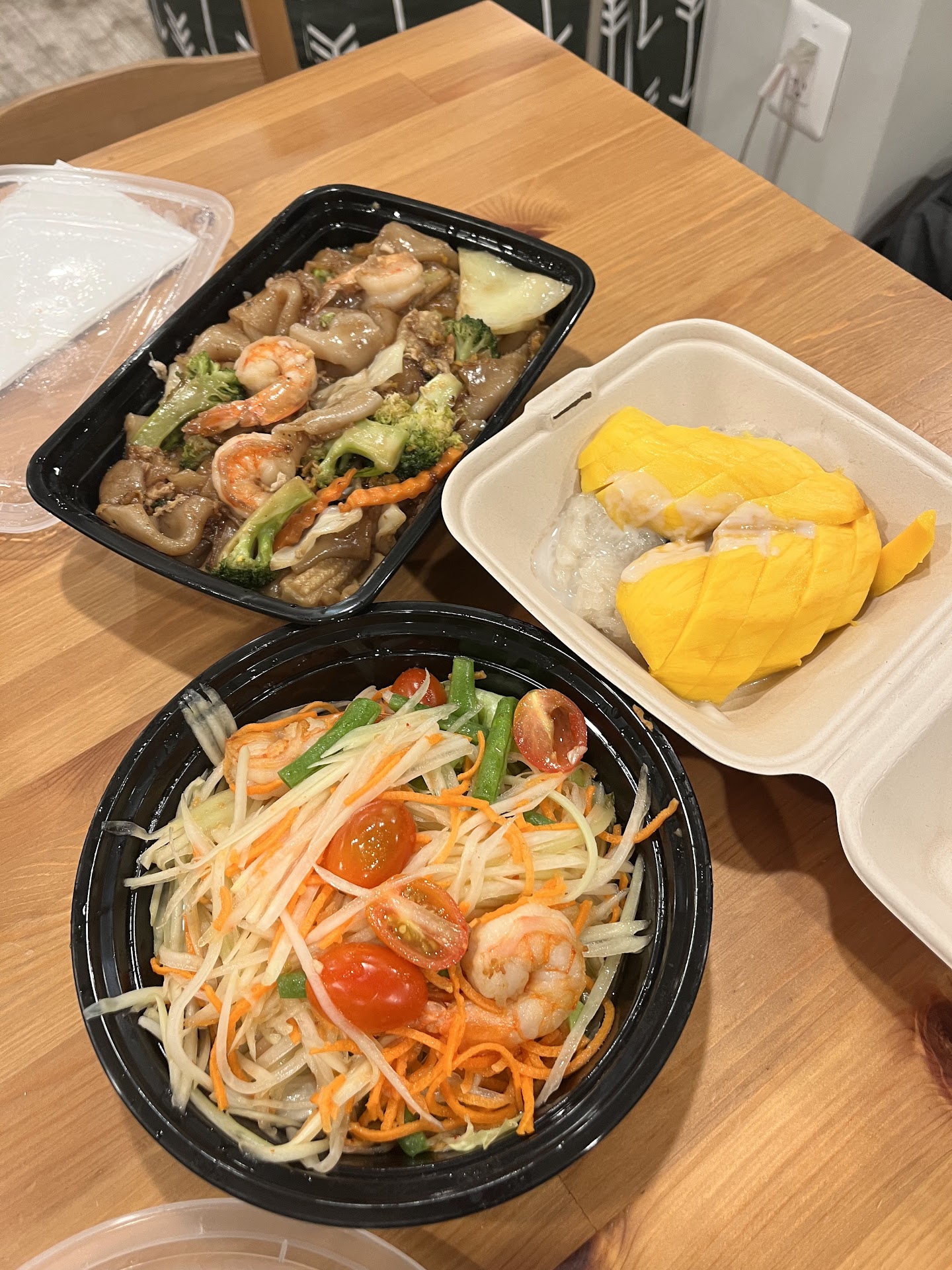 I ordered their pad see ew with vegetables and shrimp, papaya salad, and mango sticky rice -- each dish was fantastic, and they had generous portions; this was plenty of food for 2-2.5 meals. I put everything at their "regular" spice level, which didn't seem to be super consistent across their dishes. The pad see ew was hardly spicy, while the papaya salad made me run for a glass of water.