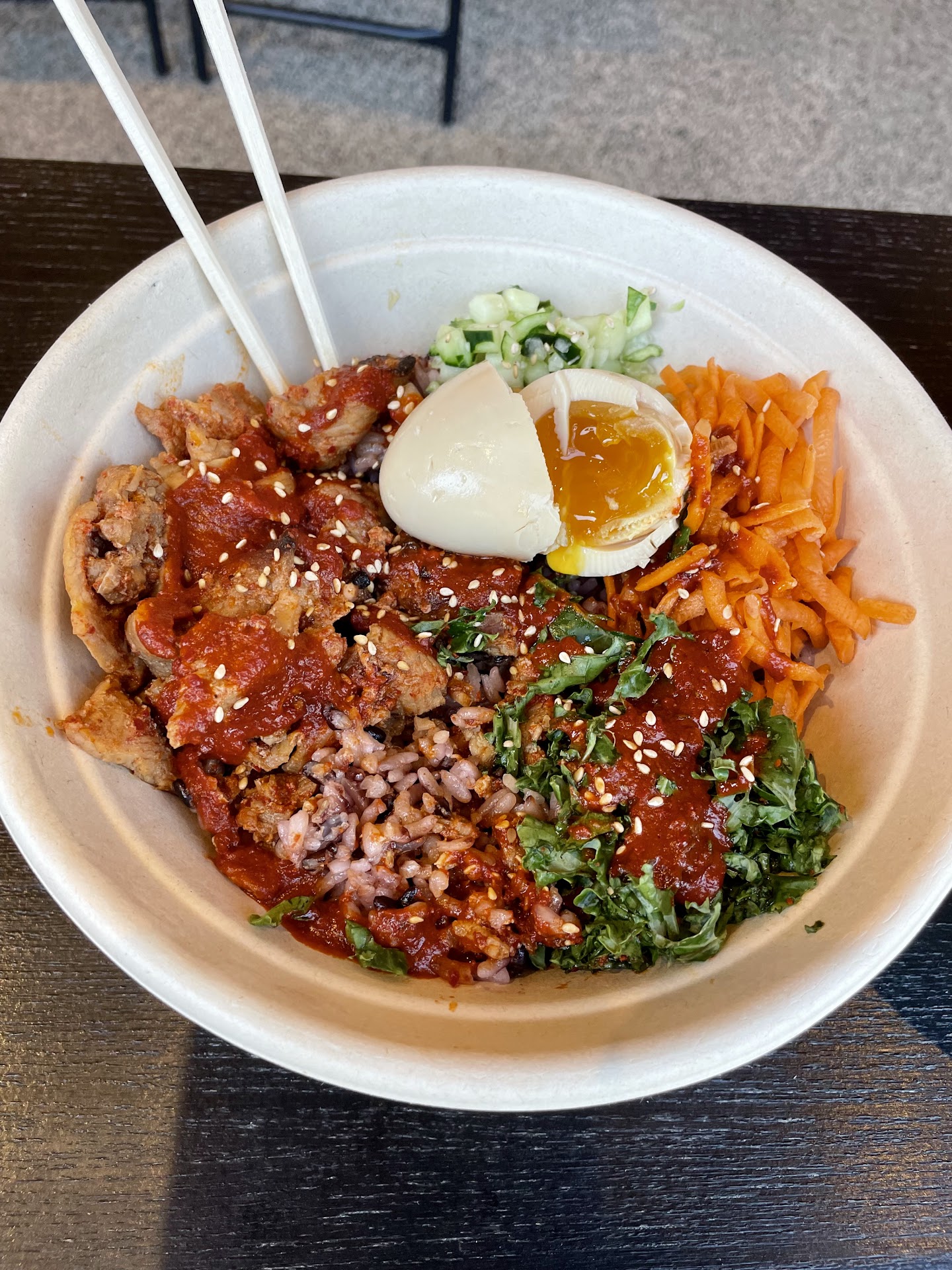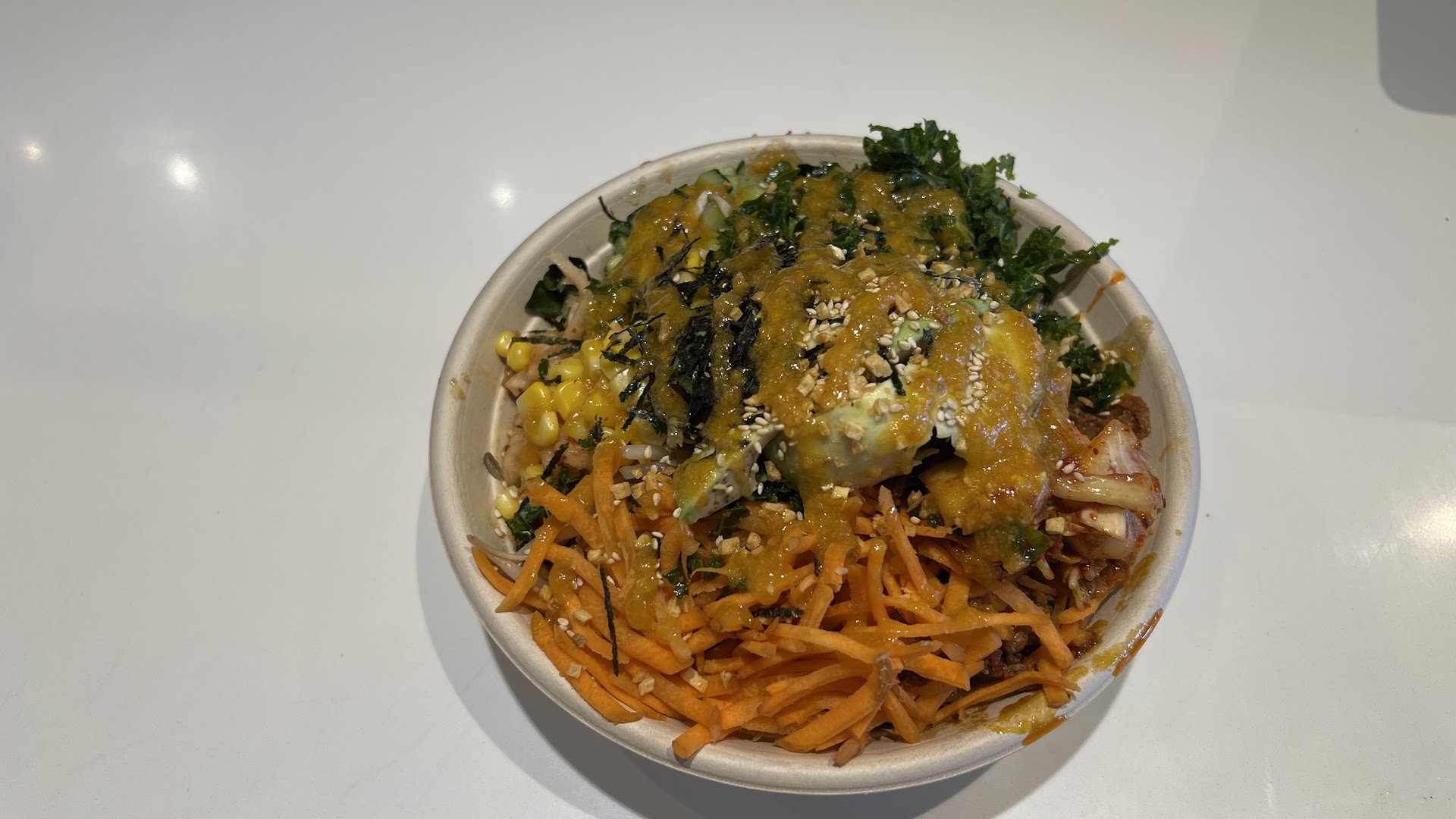 Food: The ingredients were fresh, and the portion size was generous. I opted for a build-your-own bowl, and the combination of veggies, protein, and sauces was well-balanced. The ginger-carrot sauce added a nice kick, and the kimchi and sesame seeds brought great texture and flavor. However, some toppings could have been more evenly distributed.