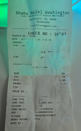 Read moreShah's at 1331 Connecticut Ave. NW fell short of expectations during my recent visit Sunday, August 17, 2025 at 8:25 PM. Upon entering, I was noticeably ignored by the staff, despite the absence of other customers. The person who prepared my food also was the cashier, who later took my payment, walked by without a greeting or acknowledgment. When I requested assistance, I was met with a dismissive attitude. Interestingly, the staff member packing food near the cash register had to intervene and ask the cashier to attend to me. When I asked the cashier if he had seen me, he casually replied he was 'busy.' I then asked for his name, but he refused to provide it. The lack of professionalism and unfriendly service was disappointing. Not recommended for those seeking attentive...