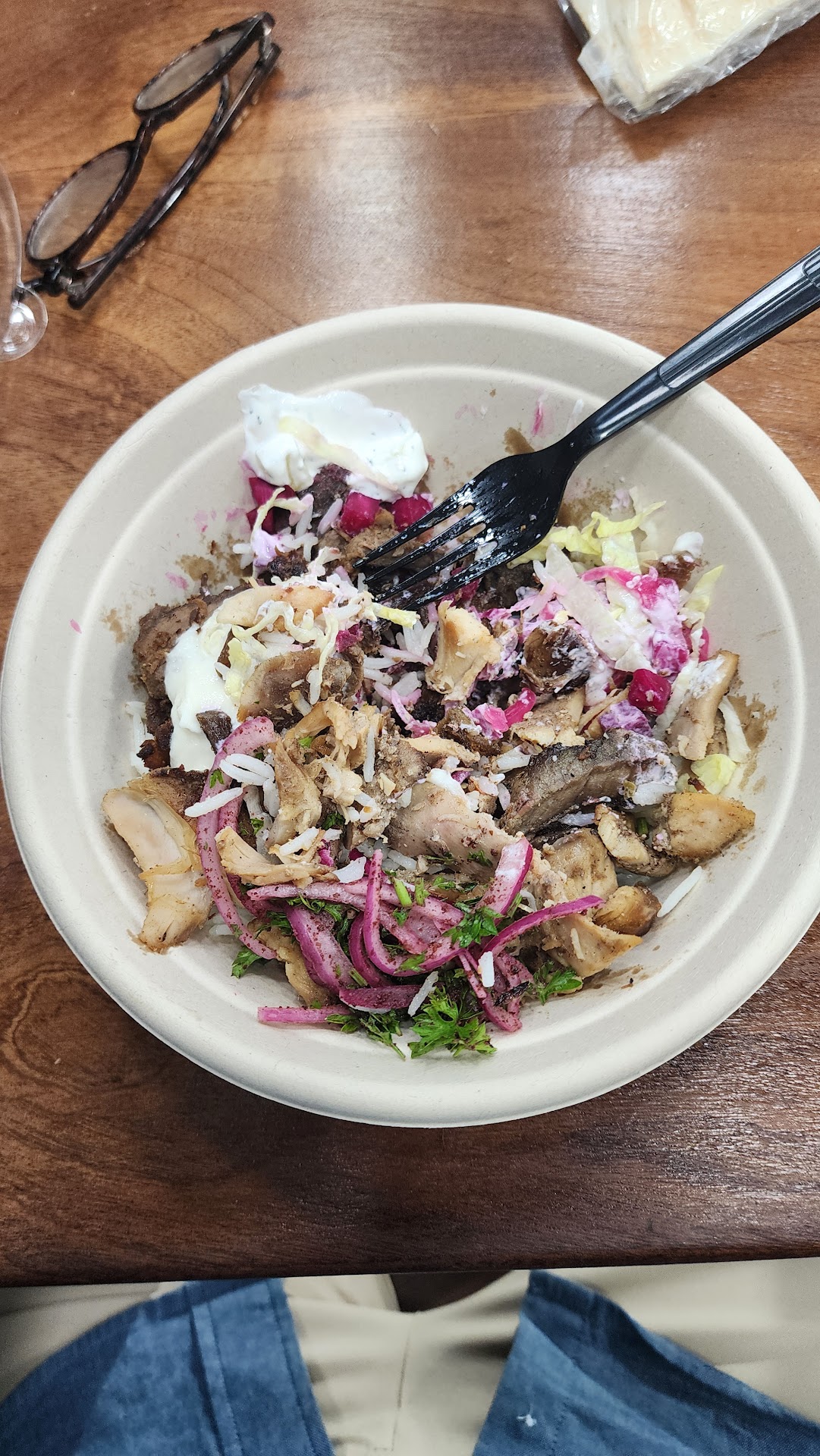 Read moreI came here during my lunch break since a. it’s close by and b. I forgot to pack lunch last night. Today’s lunch was a meat shawarma bowl with salad and rice and a bunch of toppings. I don’t remember all of them but off the top of my head I had: tomatoes, pickled onions, garlic, cucumbers, and parsley. I chose the bowl over the wrap since it seemed more filling; I got the salad/rice duo to be a bit healthier and get some greens in there. Anyways, the salad’s alright; I’ll probably just get rice next time. The environment/ambiance: outdoor seating was nice today. It’s conducive to spontaneous interactions and chats with other people eating. Of course, your mileage may vary. If it’s raining, it’s loud outside, too hot, etc, you might want to eat inside or just take it to go. Overall nice place, good food. I’ll probably be back again...
