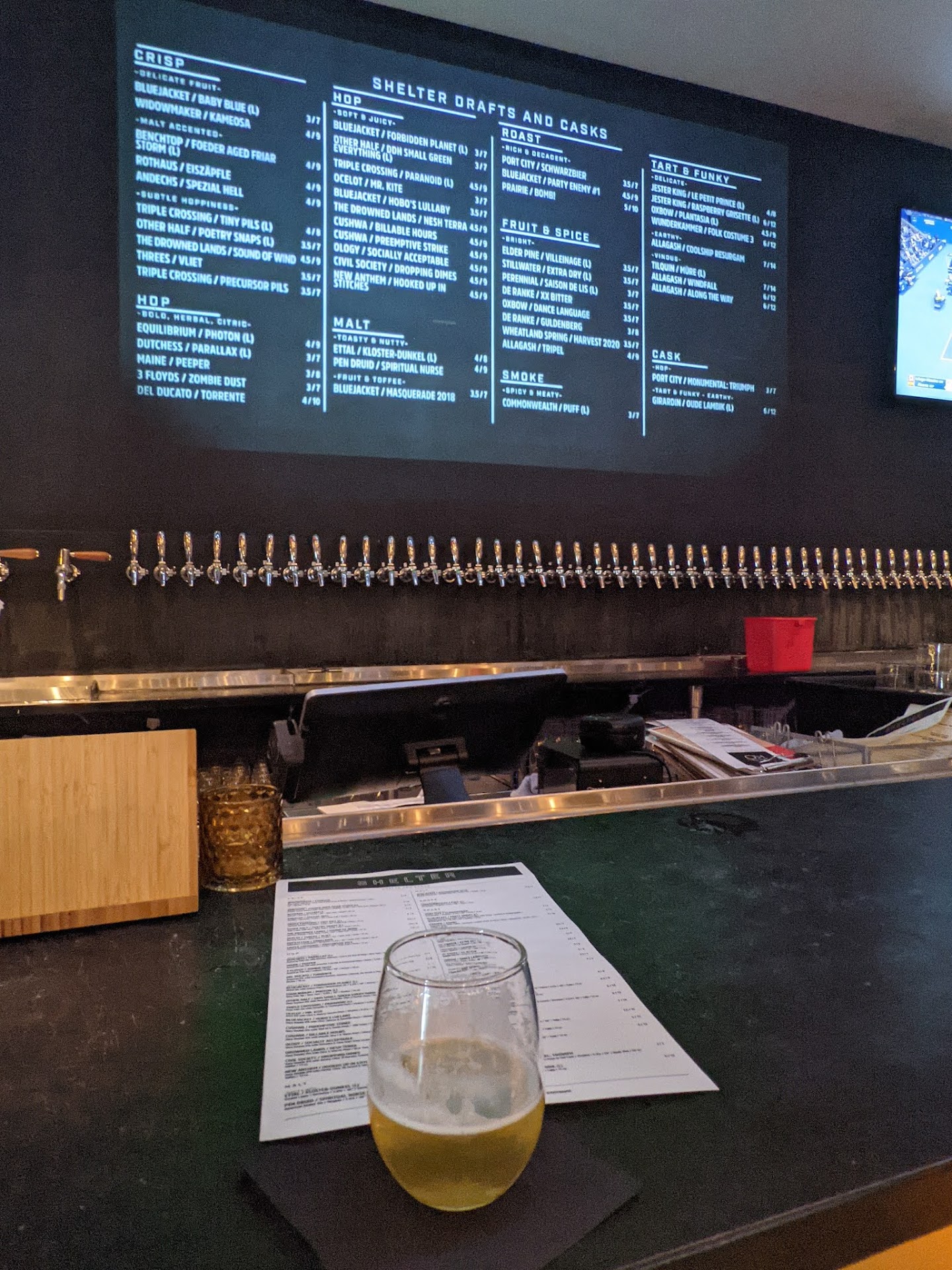 Opening with a “limited” selection of draft/cask and cans/bottles for now, you might still find yourself fumbling over which beer(s) to order much like I did. “Taster” sized glasses are also an option provided you’re unsure of that sour you’d heard about. Also-also, Shelter has compostable cups for to-go beers which will come in handy especially if you’re getting takeout from Red Apron or Hi/Fi.