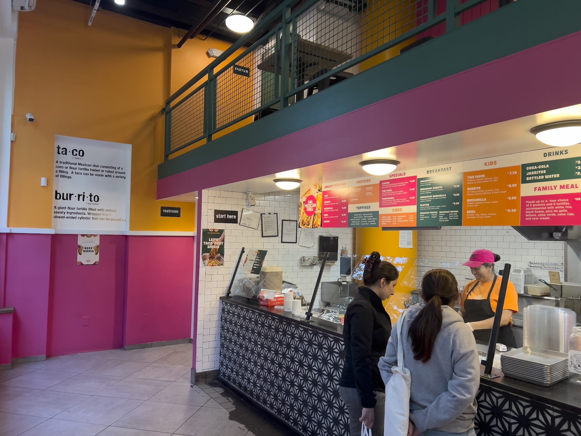 The staff is always very friendly and patient. It's the perfect location for fresh made to order options. When it gets busy, and the line is out the door, the crowd moves quickly. Orders are always accurate and the portions are plentiful. This location gives Chipotle a run for their money. When it comes to freshness, soft taco options, enormous burritos and bowls, all boxes are checked. Plus their frozen margaritas are awesome. They also have a happy hour special. Plus let's not forget Taco Tuesdays which includes a meat selection and two toppings.