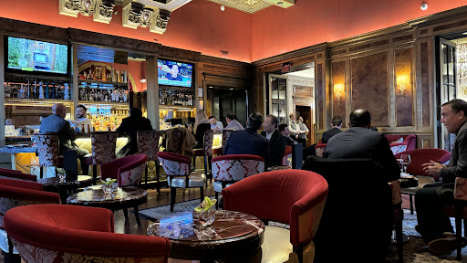 Fancy bar at the St. Regis hotel serving cocktails, wine & light bites in a warm, ornate atmosphere.