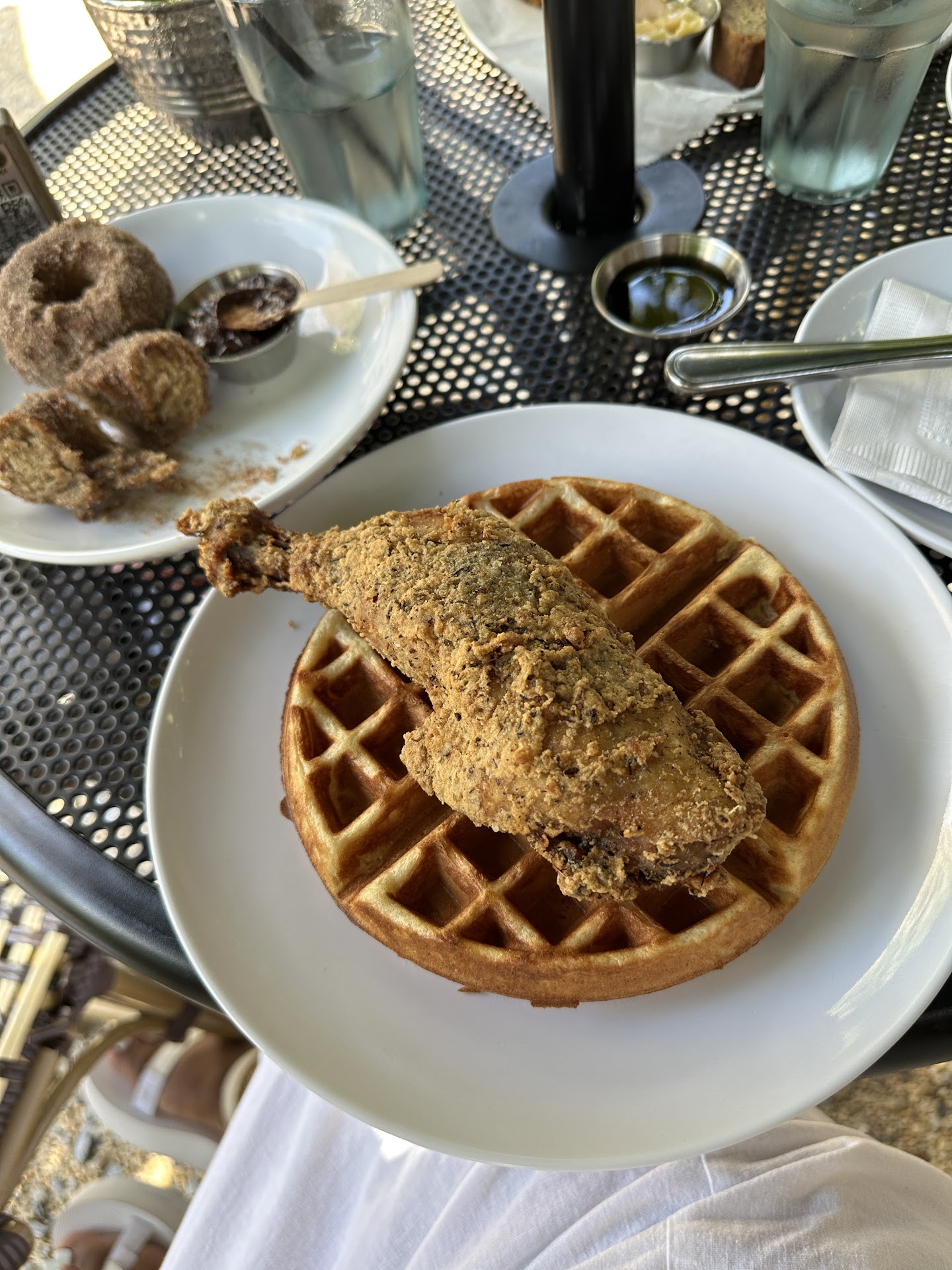 The menu was diverse, with a lot of items I hadn’t seen at other brunch spots. I decided to go with the chicken and waffles, but unfortunately, it didn’t meet my expectations. The chicken lacked seasoning, and the waffle was a bit too crunchy for my taste. On the upside, we also ordered the pastry basket, which was a hit. The banana bread, biscuit with jam, and sweet butter were all delicious, and the cinnamon donuts with chocolate icing were a perfect sweet treat.