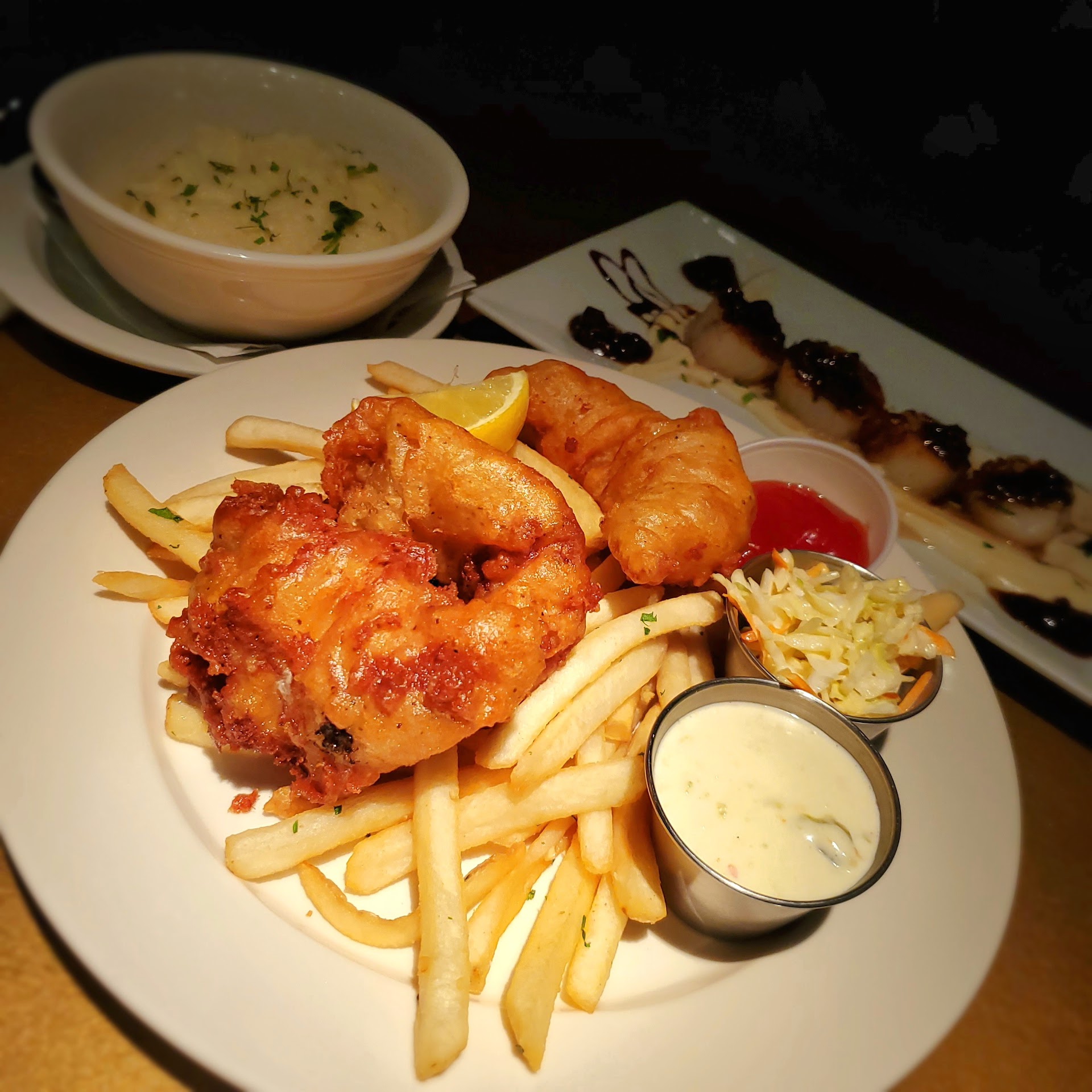 The Fish and Chips were good. A little oily on the battering, but tasty nonetheless. The fries included were also enjoyable--thinly sliced and just the right crispness, and the small side of cole slaw was basic but, no complaints from me. No complaints overall, actually, about the food I ordered.