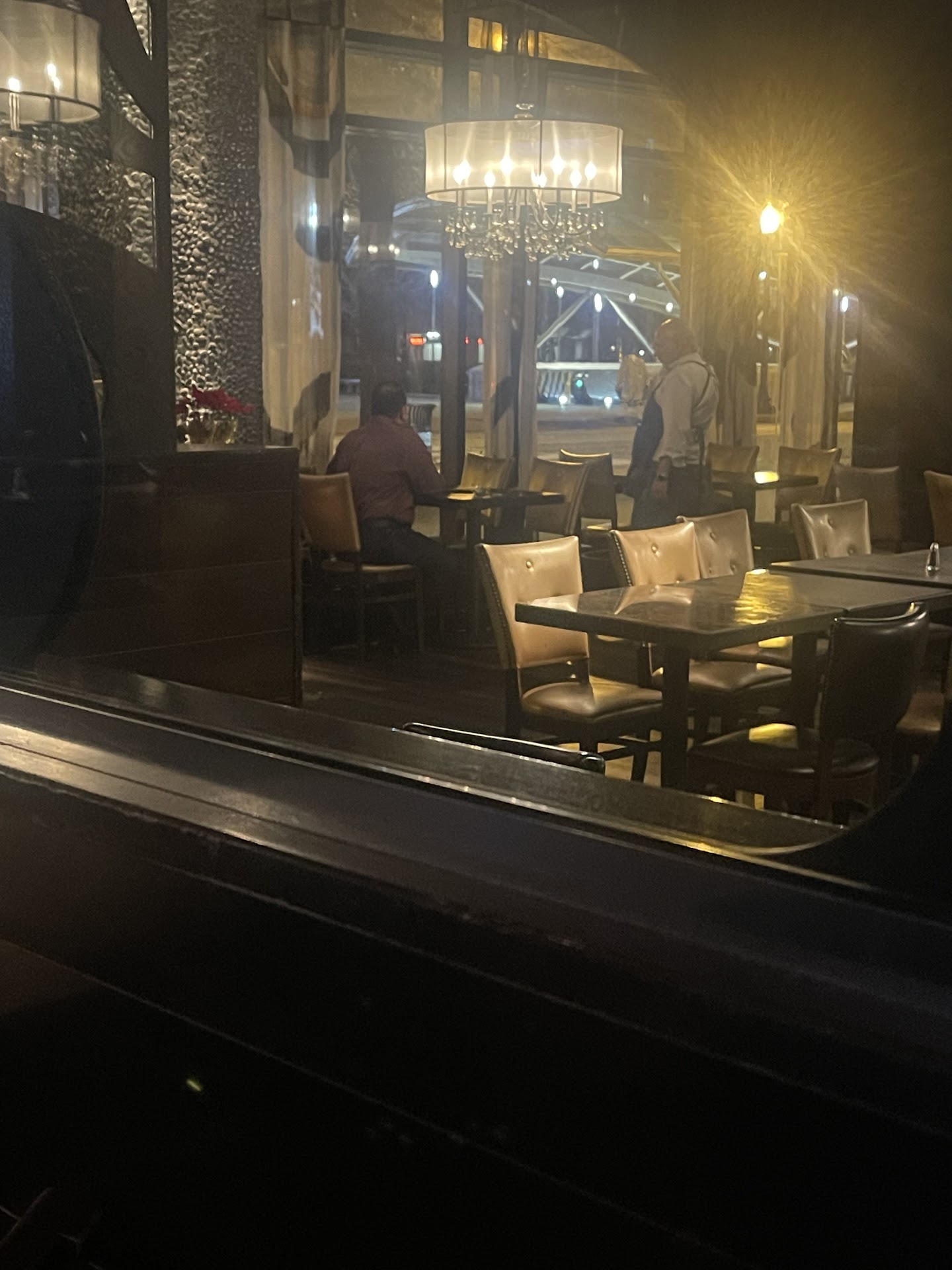 Finally, the other 2 arrived and before they had a chance to look at the menu, the server was towering over them for their orders. We understood they were 30 minutes late and the kitchen was closing at 10:30, so we asked for his recommendations and placed an order of mac & cheese, which is actually an appetizer, 2 orders of lamb chops, 1 with double order of mashed potatoes and 1 with brussels and mashed potatoes, 2 orders of lobster & shrimp linguini in an Alfredo sauce, 2 side Caesar salads and the fried red snapper with Brussels and potato gratin. This is the downside of ordering before the kitchen closes. The mac & cheese came out first. The ladies put a plate on top to keep it warm while waiting for the entrees. When the server realized the mac & cheese was going to be eaten as part of the meal, the entrees started to come out. The lamb chops, then the linguini and finally the snapper. The mac & cheese was still piping hot, but the just served lambchops were cold. The lobster in the linguini was mushy and the snapper was fried EXTRA hard. The server took the lambchops and had fresh plates made. He looked at the snapper and said well that's just how they make it. I could barely cut a piece with a knife, so he took it and brought back a menu. The kitchen is closing, so I opted not to order anything else and the ladies with the linguini ate around the lobster. Shortly after bringing the replacement plates, the server brought the check. Now we watched him being celebratory desserts to the other 2 tables and were hoping to get the same as we were celebrating as well. Yet when i asked about ordering dessert he said "no the kitchen is closed" and walked away. There was another server who was very attentive to our table as he saw our server was not friendly to us at all as compared to the other 2 tables he was serving, so he came over asked if we needed boxes and what we were celebrating. Once he brought the boxes, he offered to box the leftovers and then brought us a round of shots.