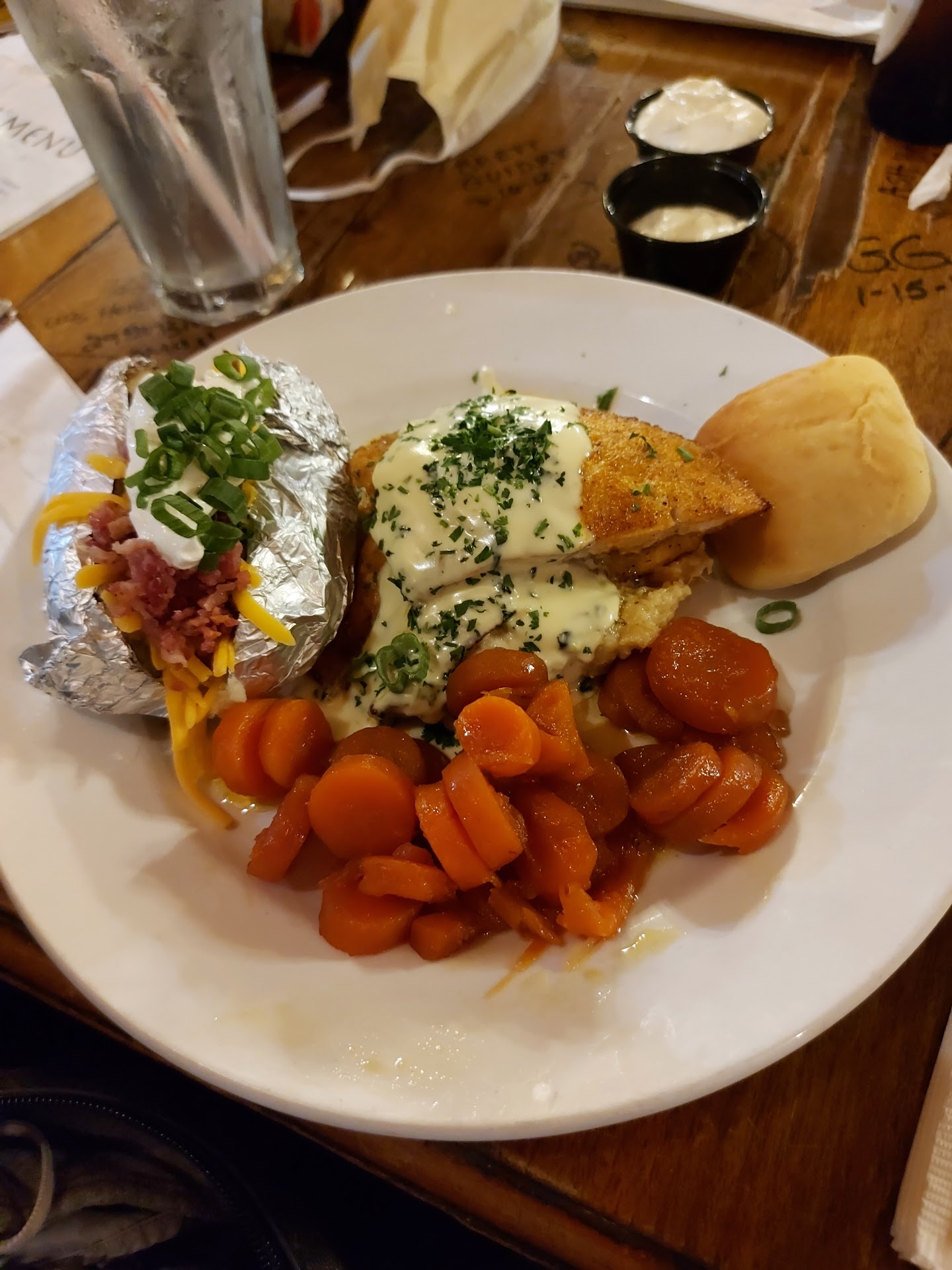 I would like to start by saying I would rather give a 2 1/2 star. Now on to my wife and Iās review, for our appetizers we had a cup of seafood Gumbo all around ānormalā flavors not as dark as most seafood Gumbos came out Luke warm. We then had the Eggplant Belle Rose, the best thing which was the only hot item was the fried Eggplant it was very delicious, the sauce was warm was good but not very distinct felt like a big scoop of mush. For the entrees, we had 1 special which was a Grouper topped with seafood sauce with Asparagus and stuffed potato. The other was the menu item Redfish Lafourche with Yam Pattieās and carrots. The special was $29.99 and the Redfish $23.99 the serving sizes surprisingly small pieces of fish. Both entrees also came out warm not hot. The special fish was fresh tasting and good asparagus cooked good but cold. For the stuffed potato āhorribleā seemed like a frozen reheated packaged potato which tasted of rehydrated bacon bits. The redfish was just normal grilled ok. Two small yam Pattieās best thing on plate. The carrots were very sweet like cooked in a syrup and the stuffing was very mushy while both dishes slathered with seafood sauce. My wife and I never get dessert because we are normally full from dinner we both agreed we could eat dessert so we went for the bread pudding. Our waitress comes out and says be very careful the desserts are HOT for once we had hope. Well my wifeās was very hot mine was warm on outside cold on inside. Taste of both was good but not great. Suggestion when microwaving put one Bread-pudding in at a time so both are HOT. We drove 45 minutes to try not saying itās terrible but not worth the visit again and hope this review helps others decide.